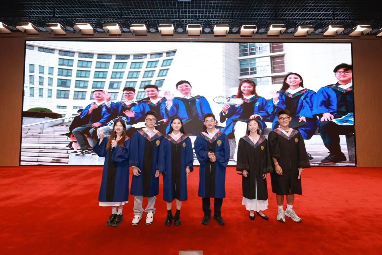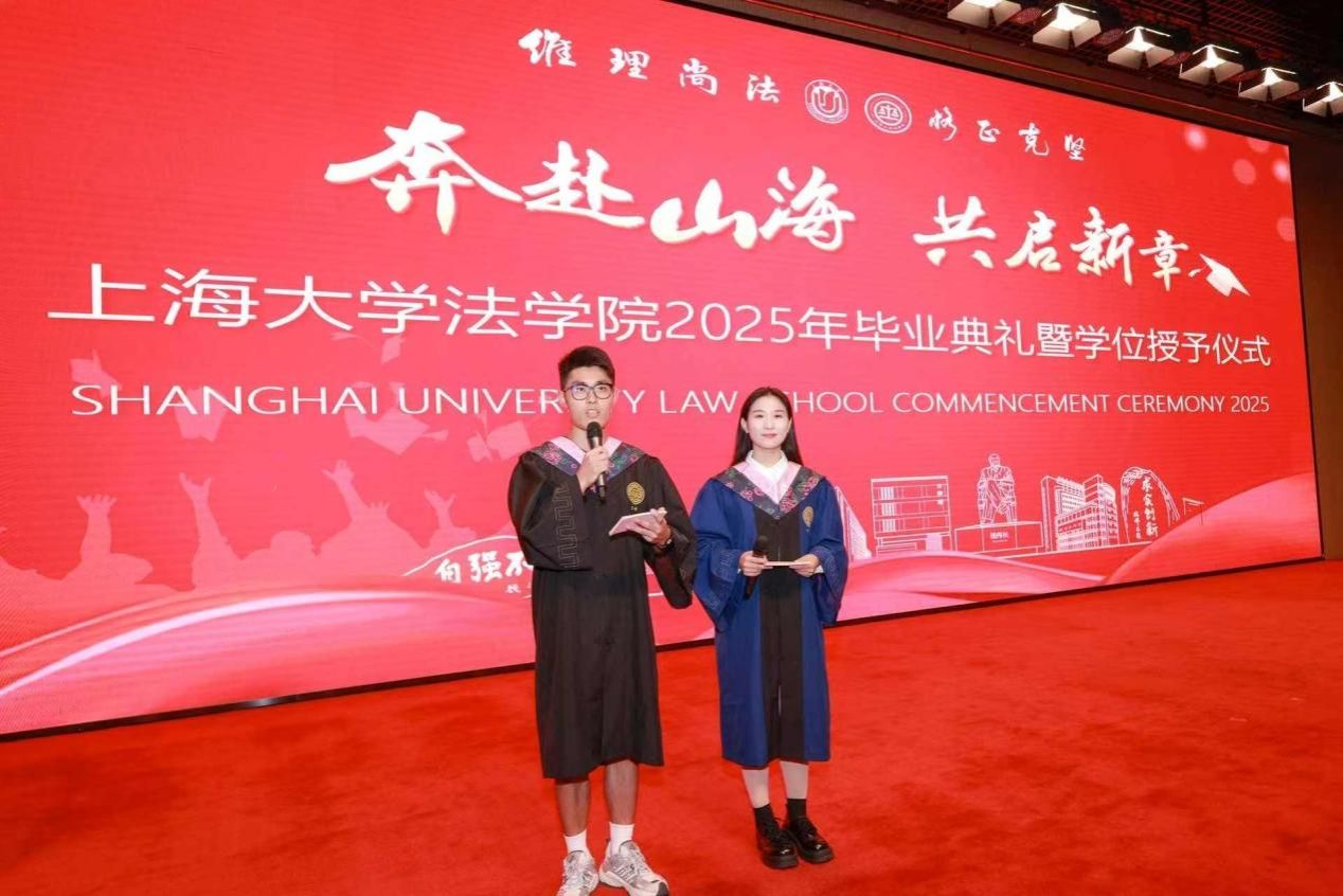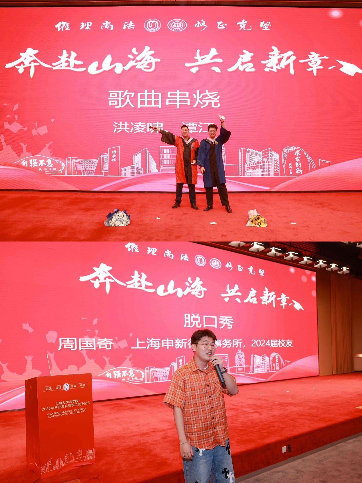 场中洪凌啸博士、2025届硕士研究生谭江合作贡献一场意犹未尽的歌曲串烧,以及2024届校友、上海申新律师事务所周国奇的脱口秀,为典礼的进行增添一份欢乐的气息,调动了现场参与人员的热情气氛。
