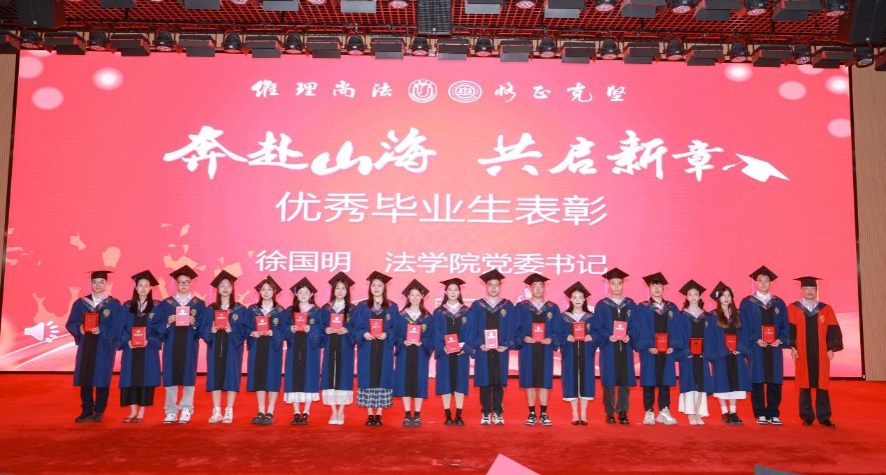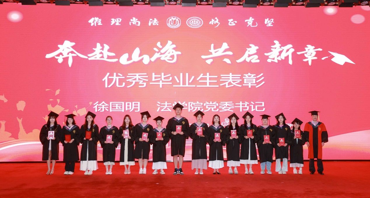 在法学院求学期间,有这样一群同学,他们以笔为剑,以梦为马,在学术研究、专业实践和社会服务中取得了优异成绩。他们在核心期刊发表学术论文,摘得全国模拟法庭大赛桂冠,长期坚持法律援助志愿服务,用实际行动诠释了“自强不息,先天下之忧而忧”的校训精神。由法学院党委书记徐国明老师宣读了2025届优秀毕业生表彰决定,并为他们颁奖。