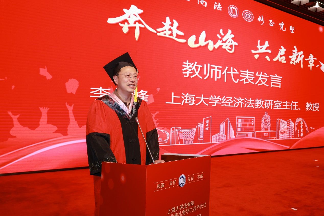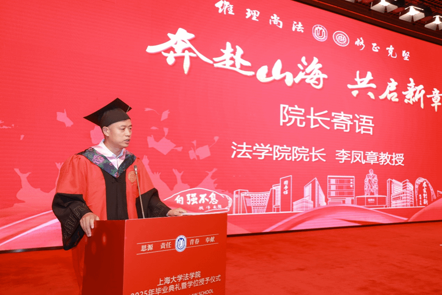 Beat365唯一官方网站法学院院长李凤章教授向全体毕业生致以衷心祝贺,并给予殷切期望。他坦言,当今世界充满不确定性和挑战,但同学们凭借理性和坚定,能够变得值得信赖。强调在AI时代,法学院毕业生应努力成为合格的“私民”,即民法意义上的独立个体。他引用经典,结合民法典颁布的背景,阐述了民法培养独立、理性、负责个体的重要性。李院长鼓励毕业生正心诚意,学会理性决策,承担责任,并从民法的三大原则出发,塑造成为生活的强者。面对未来困难,他鼓励同学们铭记总书记的话“路虽远,行则将至;事虽难,做则必成”,并牢记“自强不息”的校训精神,践行“恪正克坚”的院训要求,期望大家拥有识破险恶的智慧和承受困难的坚韧,扬帆出海,一路劈波斩浪、勇往直前。