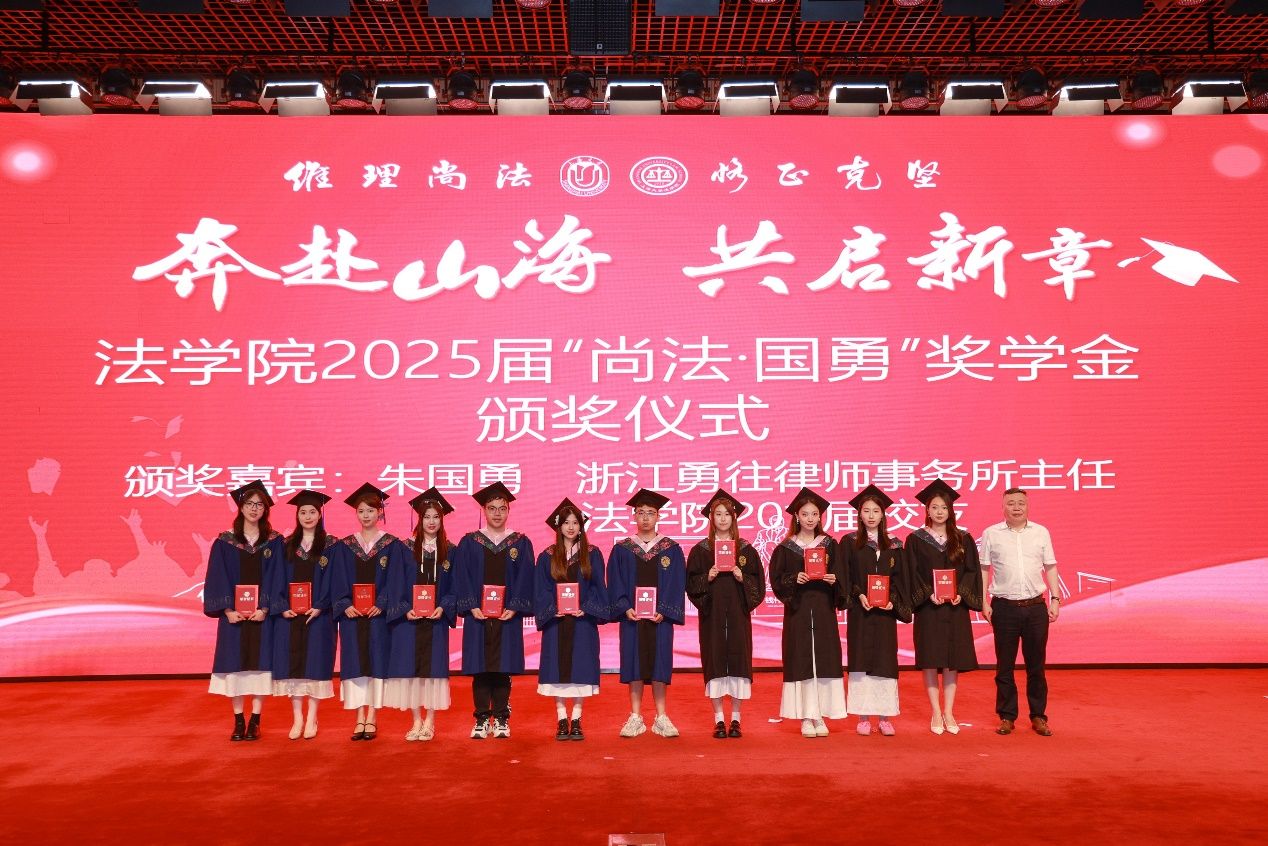 随后举行的是2025年“尚法·国勇"奖学金颁奖仪式。法学院的发展一直受到社会各界的广泛关注与支持。“尚法·国勇”升学就业奖学金,旨在表彰和奖励在学业上勤奋努力以及在就业方面表现突出的浙江籍学生。浙江勇往律师事务所主任、法学院2011届校友朱国勇先生为获得“尚法·国勇”奖学金的同学颁奖,并祝贺大家毕业快乐。