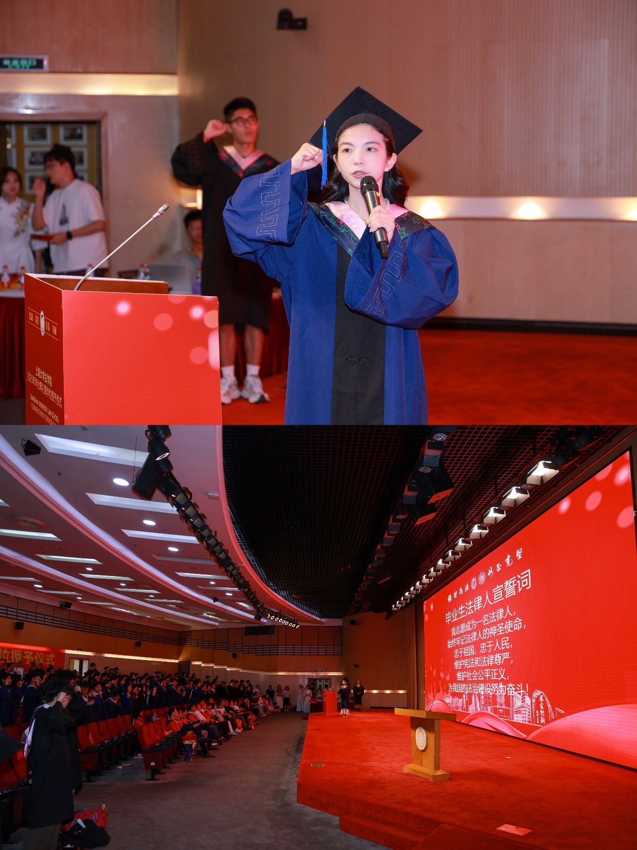 在法学院的毕业典礼上举行毕业生法律人宣誓仪式,是法学院多年来始终坚守的庄重传统。在2025年毕业生法律人宣誓环节,上海市优秀毕业生、2025届硕士研究生代表高越带领全体毕业生再一次重温法律人誓言,表达了毕业生们坚守法律人理想的坚定信念。