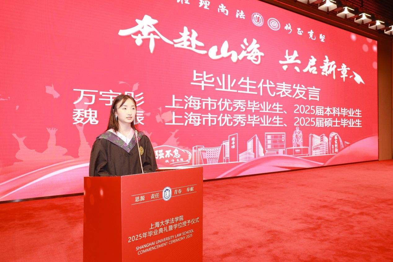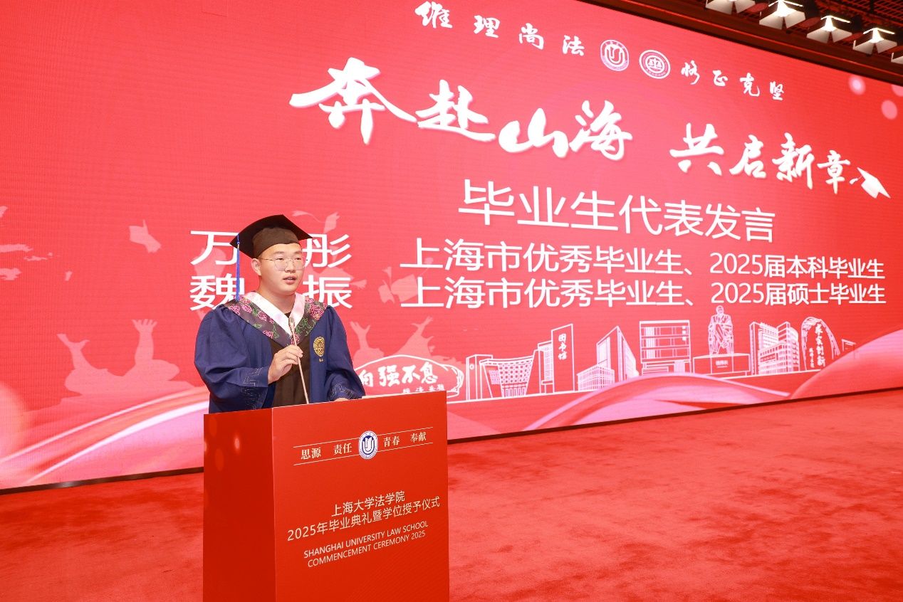 上海市优秀毕业生、2025届本科毕业生代表万宇彤同学以自己的亲身经历和感受为主线,回顾了在法学院四年的学习和成长历程,分享了自己在法学专业上的探索与收获,以及在自我认知和人生选择上的思考与感悟。同时,也表达了对母校、老师、同学的感激和不舍之情,对同学们未来发展的美好祝愿,以及对法学院和母校的真诚祝福。