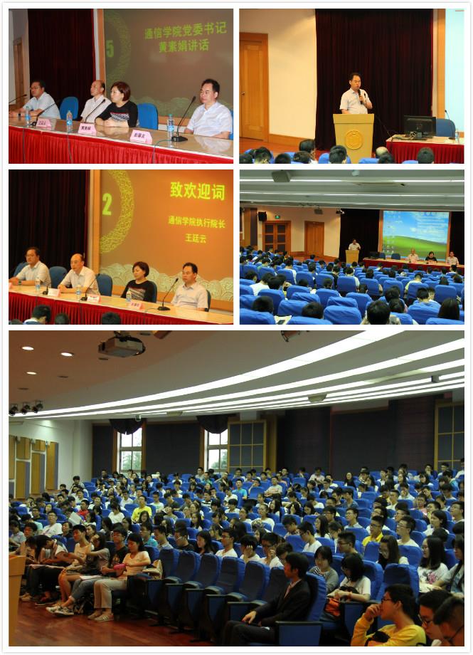 通信学院执行院长王廷云教授、通信学院党委书记黄素娟教授、通信学院副院长彭章友教授、通信学院党委副书记胡乾源老师、通信学院15级本科生辅导员陈砚颖老师、郑辉老师、各班导生以及全体15级通信学院新生欢聚一堂,共言通信,畅想未来。