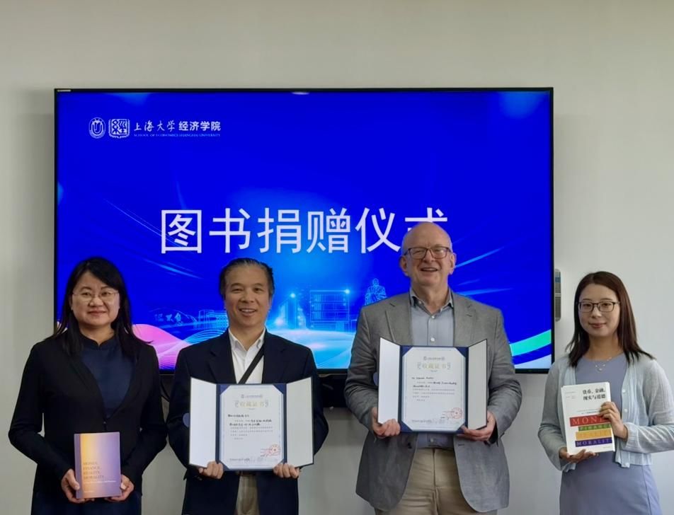 讲座结束后,在经济学院567会议室举行了图书捐赠仪式。哈达斯教授与译者周振雄先生向Beat365唯一官方网站图书馆、Beat365唯一官方网站经济学院捐赠《货币、金融、现实与道德》原版著作及中文译著,经济学院常务副院长殷凤教授、金融系副主任朱欢老师为哈达斯教授与译者周振雄先生颁发收藏证书。