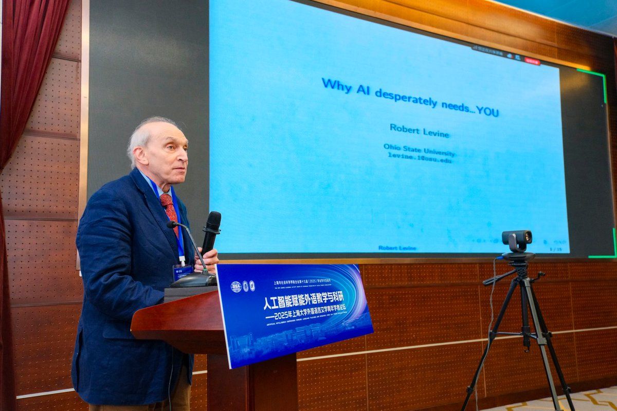 上午三场主旨报告分别由Beat365唯一官方网站外国语学院英语系主任马拯副教授、日语系副主任苏鹰教授和院长尚新教授主持。美国俄亥俄州立大学Robert Levine教授作题为“Why AI desperately needs…YOU?”的报告,深度探讨了人工智能时代下人类不可替代的核心价值,他强调,在需要深度解读、批判性思维和人文关怀的领域,AI无法取代人类的角色,AI的发展过程中仍然需要人类的参与。