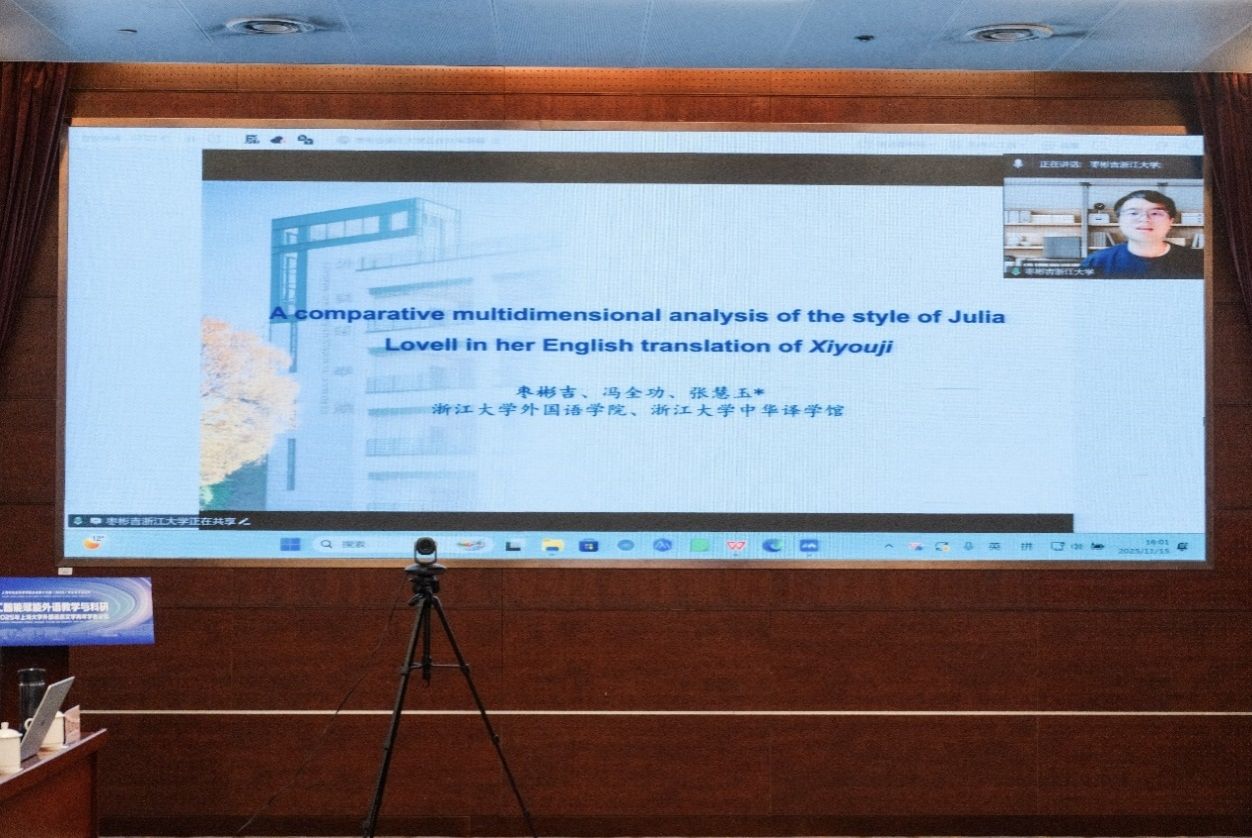 下午两场主旨报告分别由Beat365唯一官方网站外国语学院副院长戴朝晖副教授和英语系主任马拯副教授主持。浙江大学枣彬吉博士以朱莉娅·洛威尔英译《西游记》为对象,采用语料库驱动的多维度比较方法,通过跨译者和同译者两条路径,探讨译者风格的可识别性及其形成机制。其研究成果不仅证实译者风格对翻译实践的关键影响,更为翻译风格学特别是译者视觉可见性研究提供了新的理论视角与方法路径。