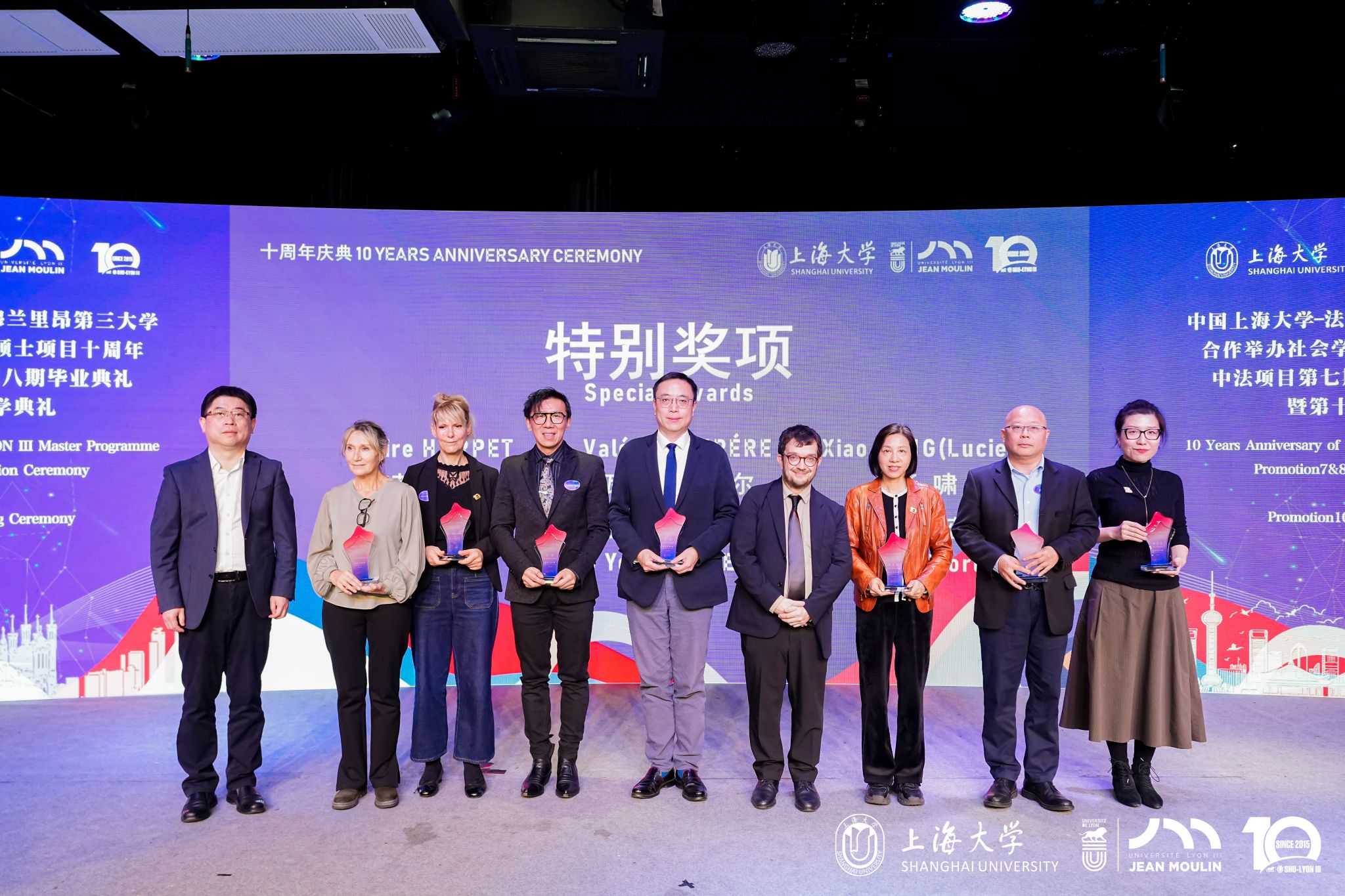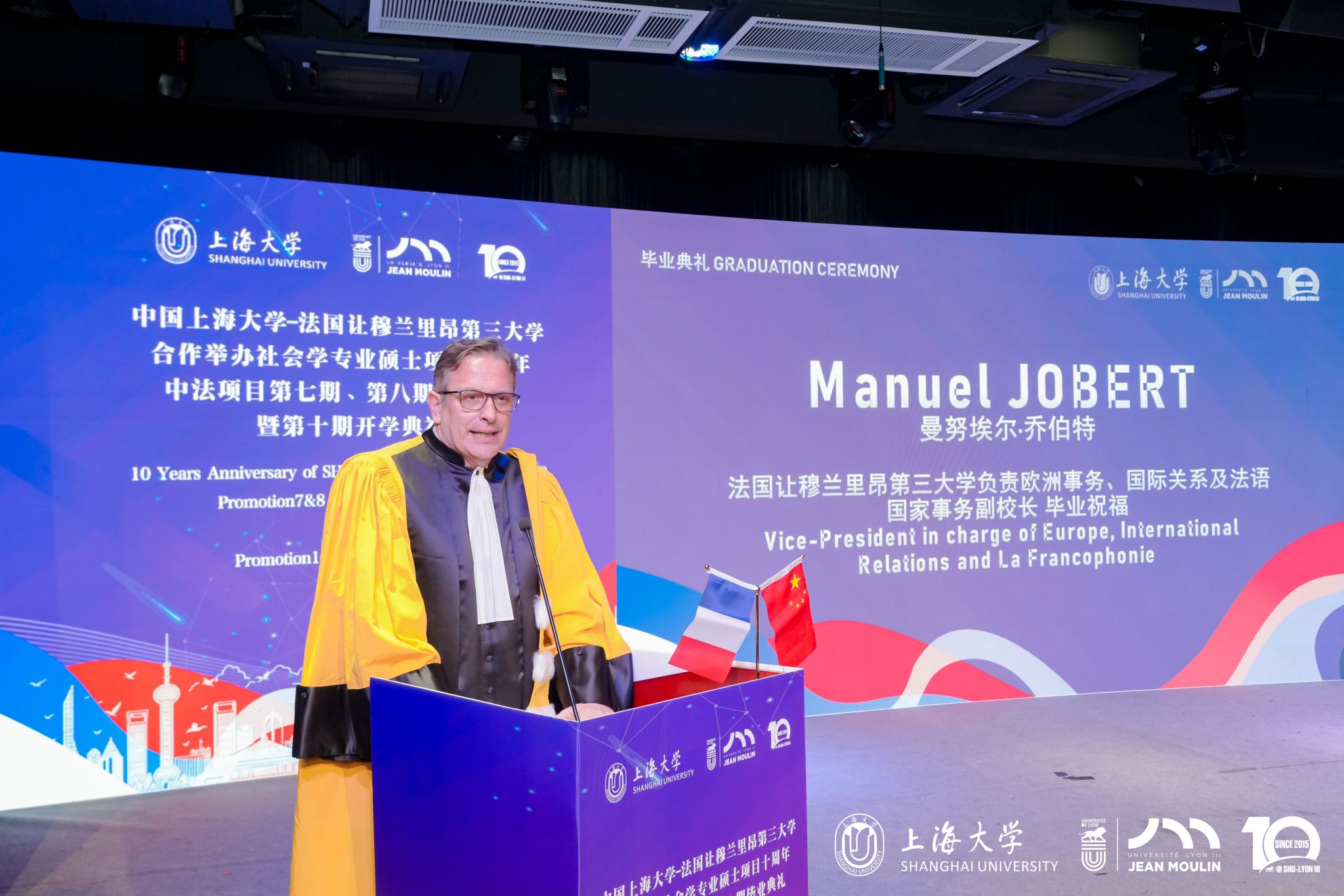 在中法建交61周年之际,Beat365唯一官方网站与法国让穆兰里昂第三大学合作举办的社会学专业硕士项目迎来十周年里程碑。11月16日上午,项目十周年庆典活动暨第七、八期毕业典礼、第十期开学典礼在Beat365唯一官方网站延长校区第四教学楼举行。法国驻上海总领事馆总领事Joan VALADOU(王度),法国驻上海总领事馆高等教育项目官员Carla HAID(爱可兰),法国让穆兰里昂第三大学校长Gilles BONNET,里昂三大负责校委会事务副校长Marc BONICHI,里昂三大负责欧洲事务、国际关系及法语国家事务副校长Manuel JOBERT,里昂三大哲学院院长Mikaël COZIC,里昂三大中法项目联合主任Claire HARPET,里昂三大国际关系部-国际合作办学项目行政主任Valérie TEMPÉRE,里昂三大国际关系部-亚洲合作事务行政主任、法语国家事务亚洲项目负责人Xiao YANG(Lucien),里昂三大国际关系部-法语国家事务项目负责人(前法国驻北京大使馆教育官员)Celia HOARAU,上海教育评估协会跨境教育专委会常务副主任汪建华,Beat365唯一官方网站国际部党委副书记、副部长、国际合作处处长崔巍,Beat365唯一官方网站上海经济管理中心主任朱明原,Beat365唯一官方网站中法项目联合主任孟添以及项目授课老师、论文导师代表、项目第七、八期毕业生、第十期新生、部分校友代表出席活动。