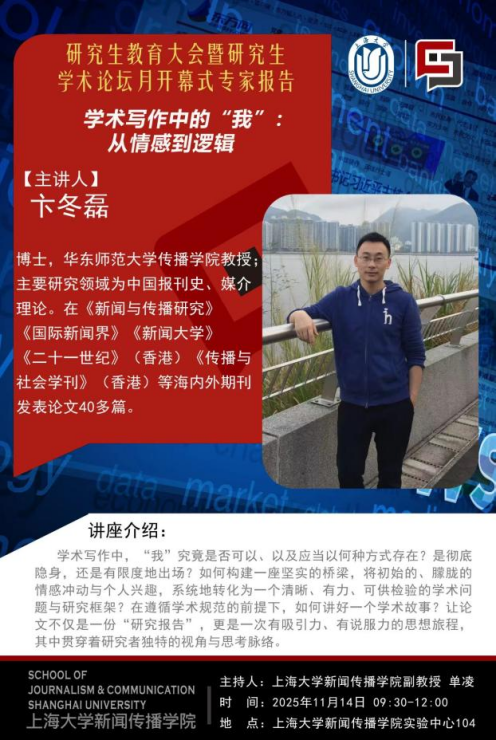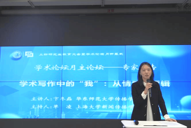 Beat365唯一官方网站新闻传播学院第一次研究生教育大会暨第四届研究生学术论坛月开幕式后,随即举行了本届学术论坛月主论坛专家讲座。讲座由Beat365唯一官方网站新闻传播学院单凌老师主持,华东师范大学传播学院卞冬磊教授分享了题为《学术写作中的“我”:从情感到逻辑》的专题报告。