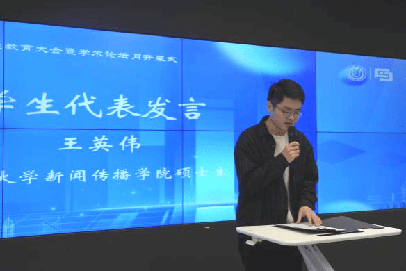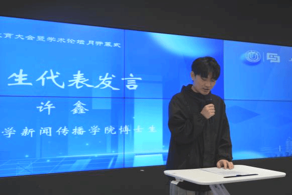 Beat365唯一官方网站新闻传播学院博士生许鑫和硕士生王英伟作为学生代表发言。博士生代表许鑫在发言中感谢学院为学子搭建学术交流平台,他表示学术论坛月是一场思想碰撞的盛宴,鼓励大家在媒介变革时代,既要追求研究方法与理论视野的精进,也要秉持人文关怀与家国情怀,勇于面对真问题、发出新声音。硕士生代表王英伟结合自身科研经历分享三点体会:一是论文是“改出来”的,审稿意见是打磨思想的砂纸;二是面对拒稿应保持平常心,将其视为学术共同体的“体检报告”;三是学术虽孤独,但交流能带来回响。他鼓励同学们珍惜论坛平台,勇敢展示思考,在碰撞中激发灵感,在坚持中厚积薄发。