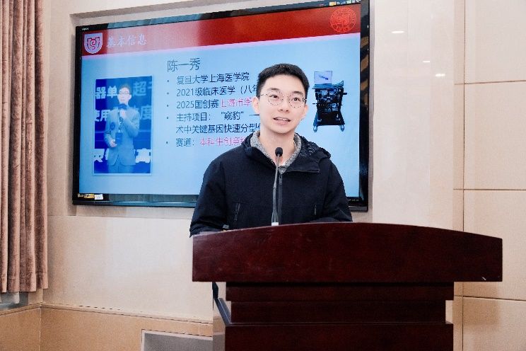 复旦大学国赛金奖项目负责人陈一秀同学以“因行生新,因新渐进”为题,从选题定位、团队协作、技术攻坚到路演答辩,梳理了项目从科研积累到赛场夺金的过程。同时,他还分享了团队协作的关键要素,强调负责人需具备学习、领导、沟通与抗压能力,并给出“做领域专家、讲完整故事、突出创新点”的备赛小贴士。