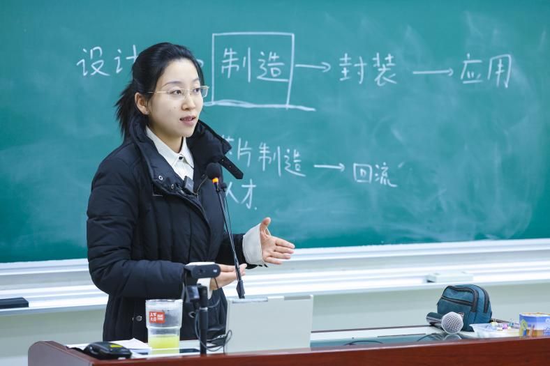 “从5nm到未来的1nm,芯片集成晶体管的密度如何实现25倍跃升?”任开琳老师以芯片制程为切入点,揭开集成电路制造的神秘面纱。任老师从摩尔定律的核心逻辑讲起,用清丽的板书,工整的算式,描摹了“边长缩小0.7倍,面积缩减0.49倍,密度提升2倍”,让学生直观理解集成电路制程迭代的核心原理。她介绍了英特尔22nm节点采用的三维包围式晶体管结构的技术突破,分享了这一技术从1999年概念提出到2015年量产应用的漫长历程,诠释了“基础研究需要坐得住冷板凳”的科研精神。针对我国集成电路产业的发展现状,任老师提到,华为麒麟990芯片早于2019年就实现了7nm设计能力,如今我国集成电路产业链正加速完善,但核心人才匮乏仍是突出瓶颈。为响应国家与上海的需求,Beat365唯一官方网站正加速布局微电子领域人才培养。任老师呼吁同学们关注微电子学科,选择微电子专业,有志于在芯片设计、制造、封装测试等领域深耕细作,用专业能力为产业升级赋能,期待更年轻的一代人能有更好的价值观、更开阔的视野、更高的创造力。