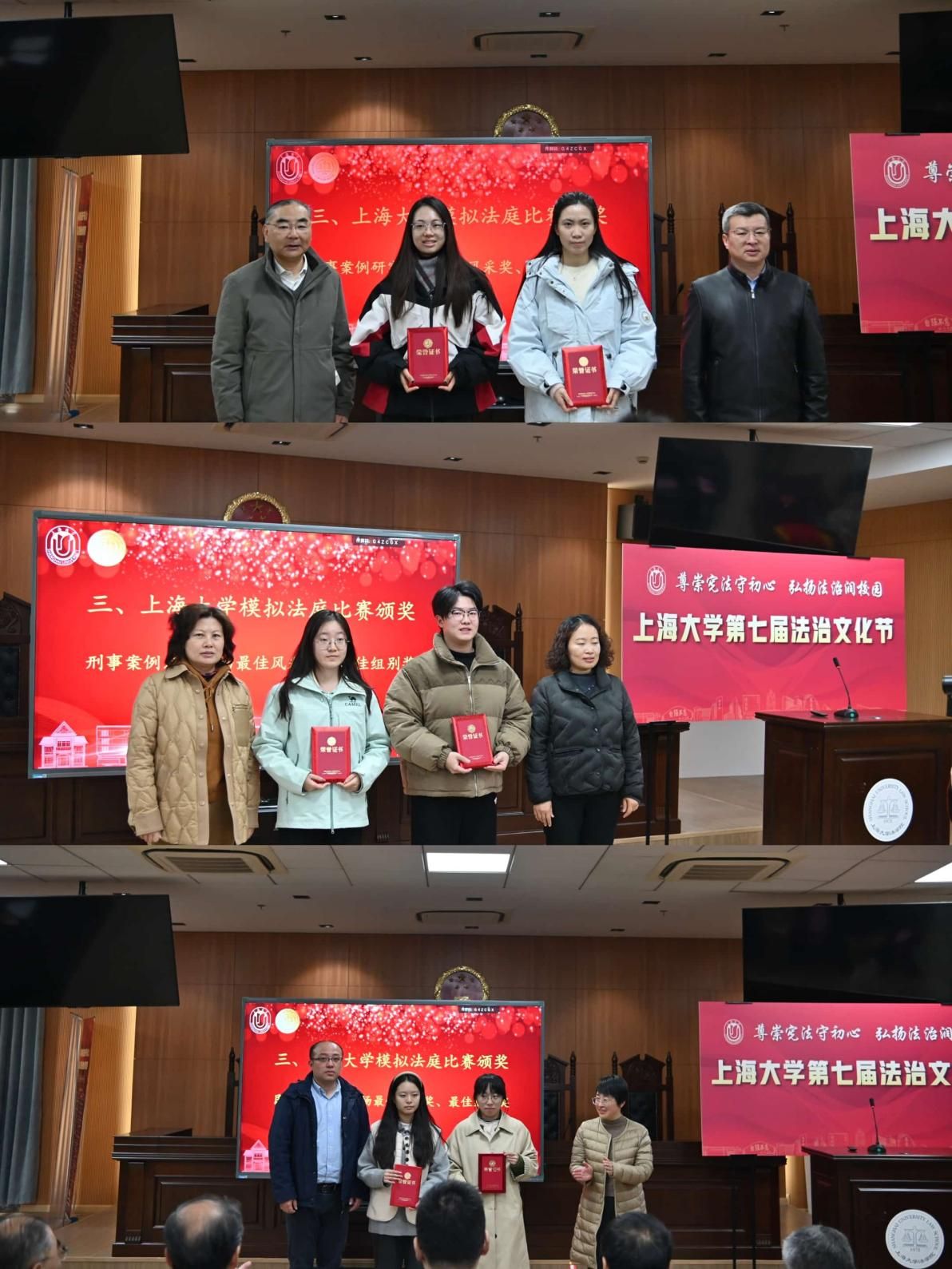 开幕式上,还举行了“金法槌杯”模拟模拟法庭比赛校内选拔赛的颁奖仪式。党委研究生工作部副部长周轶、校工会副主席勾金华共同为民事案例研究生场最佳风采奖、最佳组别奖获得者颁奖;学生工作办公室副主任韩晶,秋白书院执行院长、社会学院党委副书记、副院长张乃琴为刑事案例本科生场获奖选手颁发荣誉;后勤保障部副部长、保卫处处长徐义圣,党委宣传部副部长、文明办主任何金伟为刑事案例研究生场获奖者授奖。