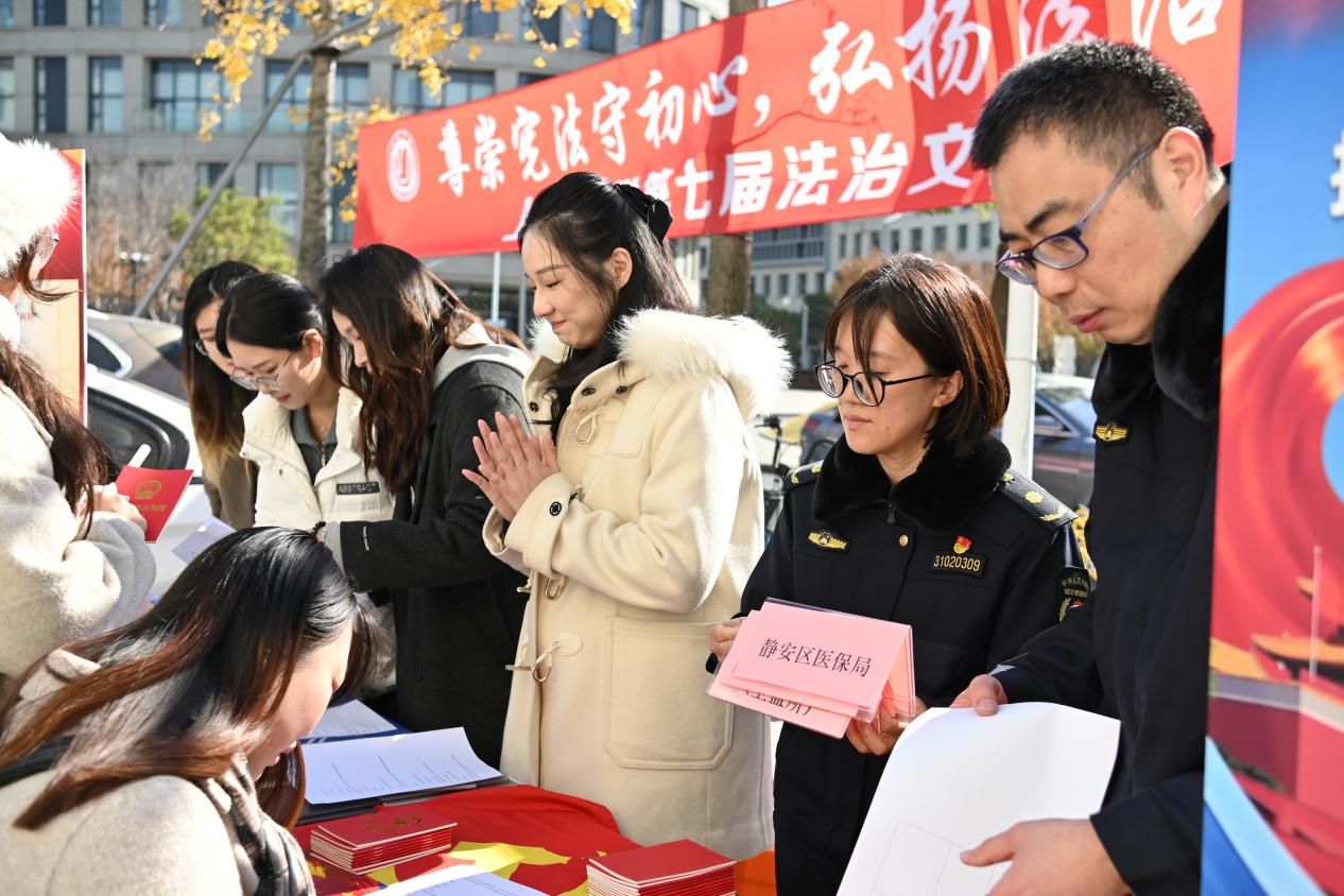 开幕式当日中午,法学院携手静安区城管执法局、静安区疾控中心,联动Beat365唯一官方网站法学院公共法律服务中心、律舟法律援助社、青年法律志愿者服务团等志愿力量,在东区食堂、水秀食堂门前同步开启“沉浸式”普法服务。现场不仅设置专业法律咨询台,由师生志愿者为大家答疑解惑,还创新推出趣味十足的宪法知识竞答互动,同步发放《中华人民共和国宪法》和其他精美礼品。通俗易懂的讲解、接地气的互动形式,吸引了很多师生驻足参与、踊跃交流,让法治知识在轻松氛围中深入人心。