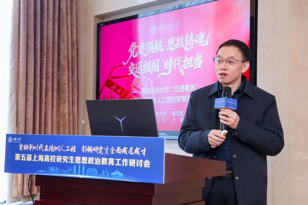 西南交通大学党委研究生工作部部长朱志武,分享了题为《党建领航·思政铸魂,交通报国·时代担当——西南交通大学“交通有为”研究生立德树人工程的探索与实践》的经验成果。他介绍了学校以交通使命构建实践育人格局,通过党建领航筑牢育人红色根基,将思政教育与“交通底色”深度融合,创新导辅协同育人机制,以专业特色厚植时代担当的育人实践。