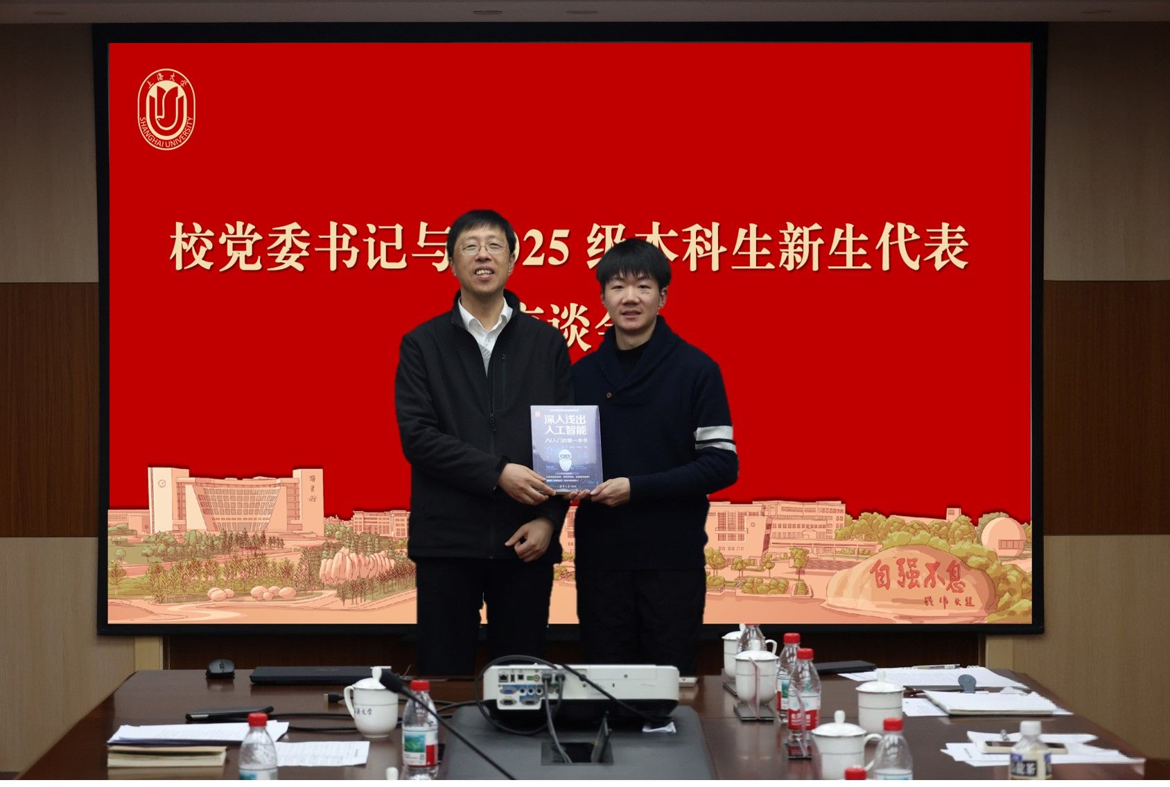 近日,校党委书记吴坚勇在宝山校区行政楼501会议室与2025级本科新生代表亲切座谈。校党委副书记、副校长胡大伟,以及本科生院、后勤保障部、党委本科生研究生工作部等相关单位负责人参会。