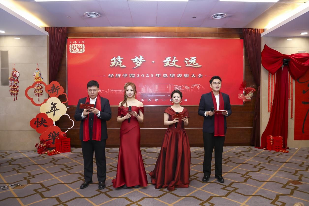 大会由经济学院金融系青年教师贺臻、张洋,本科生辅导员崔一冰,2023级本科生刘淄越联袂主持。在经济学院党委书记尹应凯对学院2025年的工作回顾中,大会正式拉开帷幕。尹应凯以“最经济”为工作汇报主题,从学科建设、人才培养、科学研究等方面全面复盘学院2025年发展答卷,号召经院师生凝心聚力、协同攻坚,在2026年以更高标准、更实举措续写学院高质量发展的新篇章。