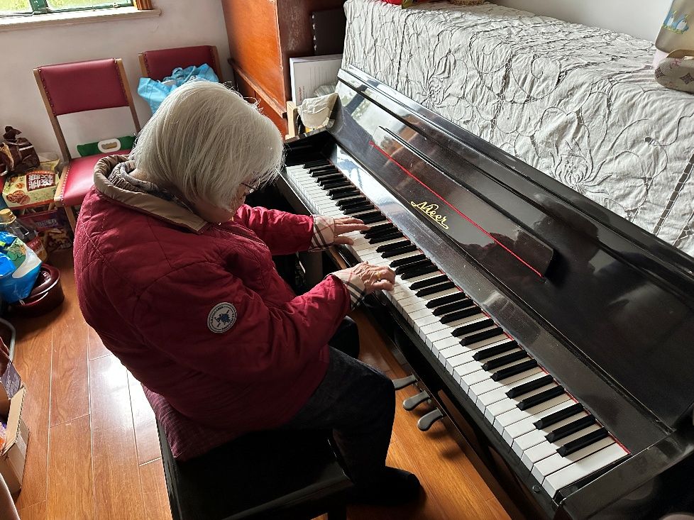 慰问组与老人们亲切交谈,细致询问他们的身体状况、生活起居与实际需求,叮嘱他们保重身体、安享晚年。老同志们也欣然分享往事,回忆起归国奉献的岁月与工作点滴,并谈及退休后对国家发展、社区建设和学校近况的持续关注。现场气氛温馨活跃:容月嫦老师兴致盎然地弹奏钢琴,悠扬旋律中流淌着对生活的热爱;俞丽和老师则谈起近期为初中生辅导数学的经历,言语间洋溢着传递知识与温暖的欣慰;更令人感动的是,年逾九十的傅克诚先生仍心系事业,专门通过PPT向大家讲解近期的工作进展,展现出老一代学人矢志不渝的钻研精神。