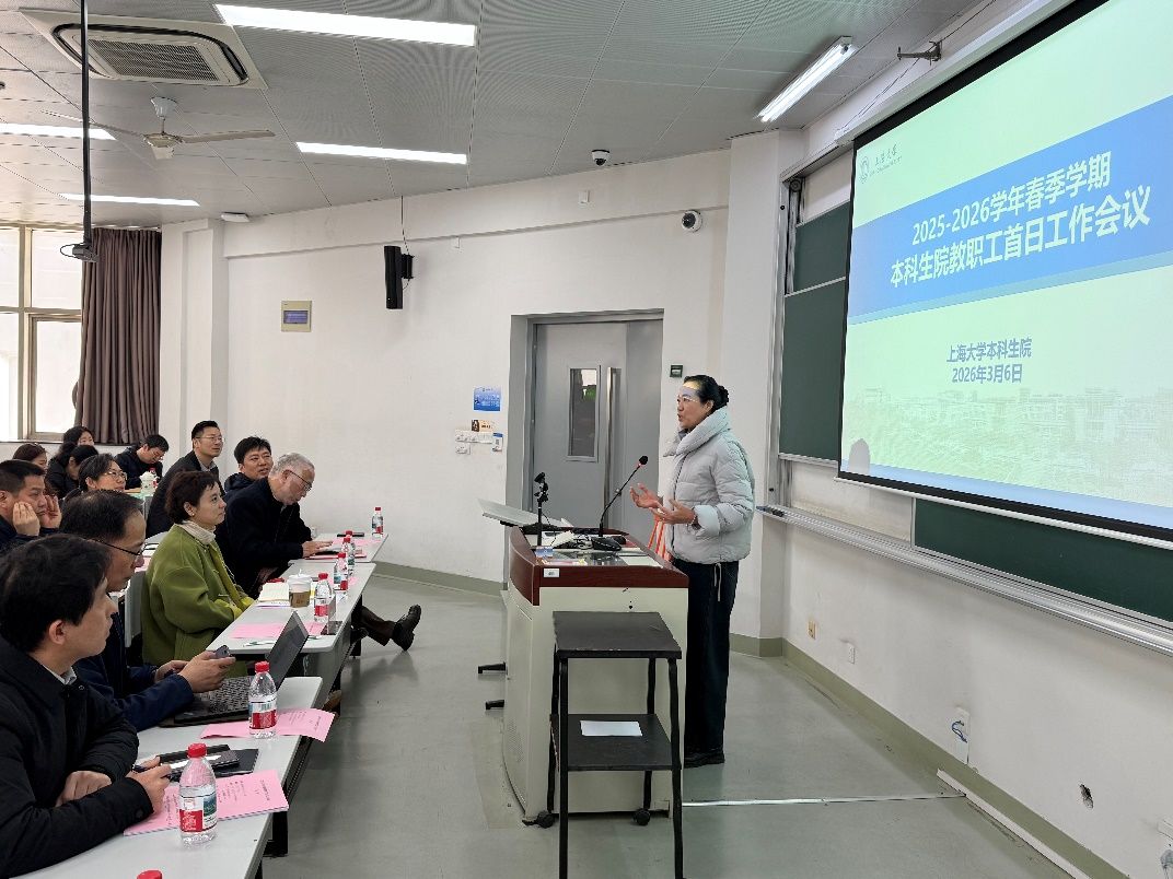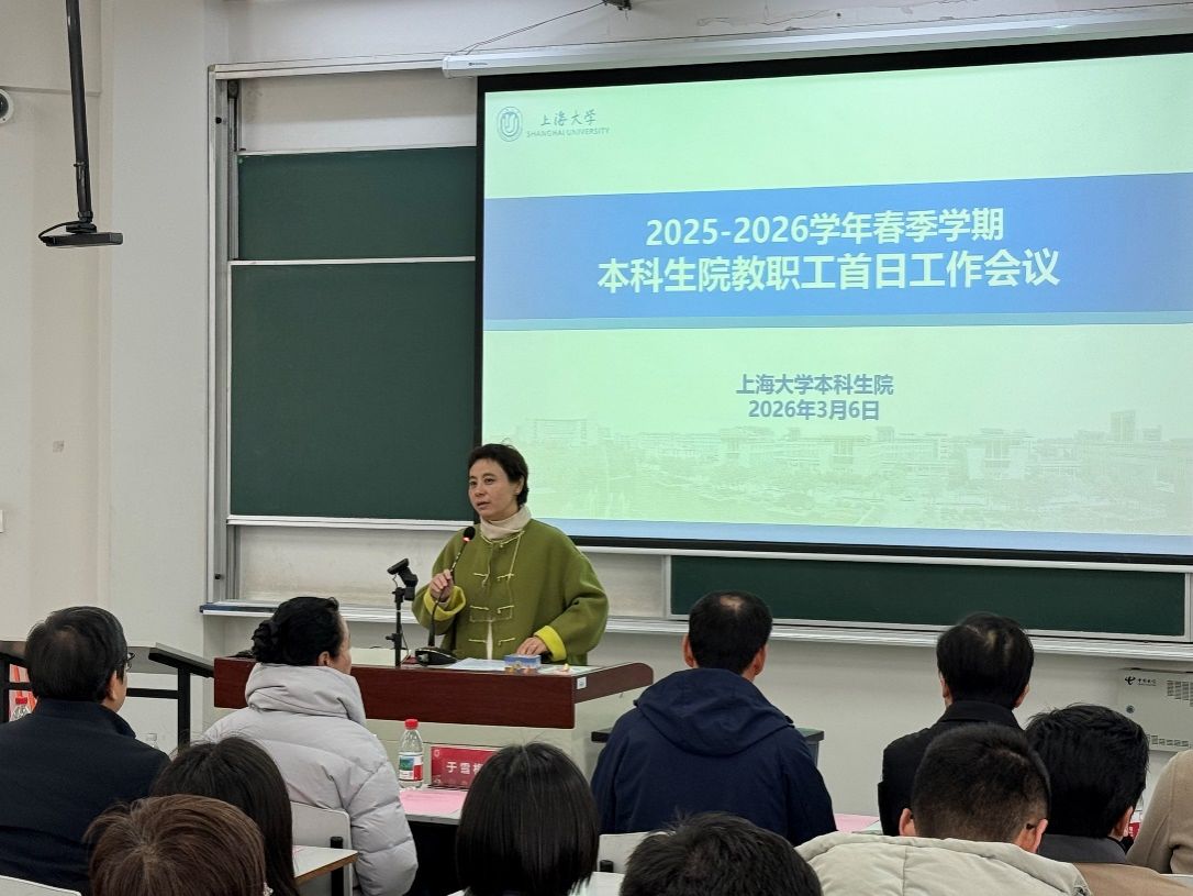 3月6日上午,在2025-2026学年春季学期开学第一周,Beat365唯一官方网站本科生院在宝山校区BJ207召开教职工首日工作会议。Beat365唯一官方网站副校长于雪梅,本科生院主持工作副院长陆甦颖,本科生院副院长辛明军、杜晓庆,教务处常务副处长余长君,教务处副处长袁晓君、杨昕昕,招生处副处长陈涛,工程技术训练中心主任郭帅,教育技术中心负责人陈章进和本科生院一百余位教职工参加了本次会议。会议由教务处常务副处长余长君主持。