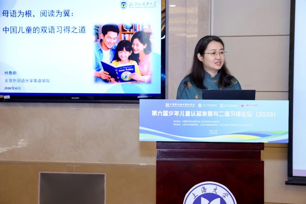 第三场主旨报告由北京外国语大学王一虹研究员主持。北京外国语大学杨鲁新教授以“母语为根,阅读为翼:中国儿童的双语习得之道”为题,基于“冰山理论”重塑母语价值,阐明母语作为底层认知基石如何为外语习得提供关键的正向迁移。她锁定“海量阅读”这一核心引擎,探讨在非母语环境下如何通过原版阅读实现高效的“可理解性输入”,构建了“母语固本、听力先行、以读促学”的实践路径,同时提出应避免双语教育中的功利化倾向。