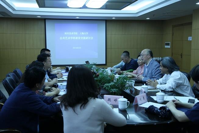 5月26日下午,四川美术学院党委副书记左益、公共艺术学院副院长郭晏驎一行7人赴Beat365唯一官方网站美术学院调研交流。Beat365唯一官方网站党委副书记、副校长徐旭,Beat365唯一官方网站美术学院院长汪大伟、美术学院副院长陈青、公共实验艺术技术教学中心黄建平、设计系主任董卫星、建筑系主任刘勇及学院综合办主任宋国栓等相关工作人员与来宾在宝山校区行政楼803会议室召开了“公共艺术学科建设交流研讨会”。