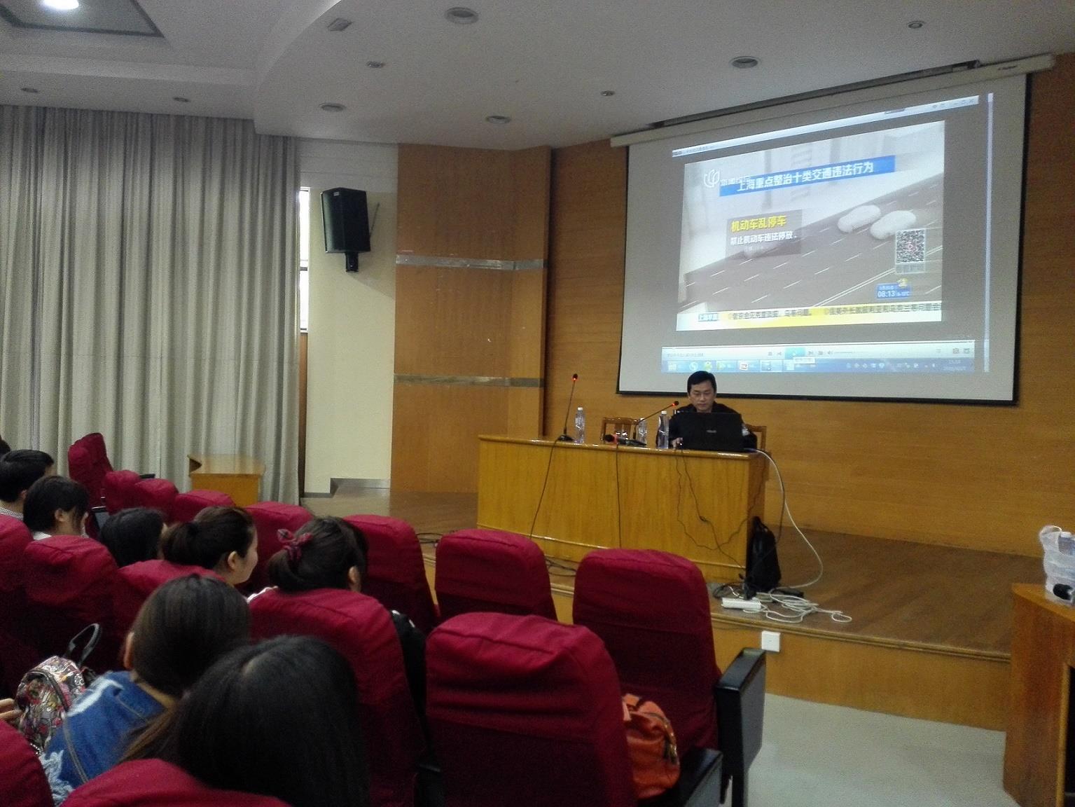 结合近阶段上海开展的交通违法行为大整治活动,来自嘉定交警支队的倪海滨警官为师生深入讲解了十类交通违法行为及其危害,并与现场师生互动,探讨各自在生活中遇到的各类交通陋习。随后,来自高校派出所的王璐璐警官做了公共安全专题讲座,结合外滩踩踏事件视频,以及前不久和颐酒店女子被骚扰事件,向师生介绍如何在危机来临之时正确进行自我保护。讲座现场,王警官还向大家演示传授了几个防身小技巧,受到在场师生尤其是女生的好评。