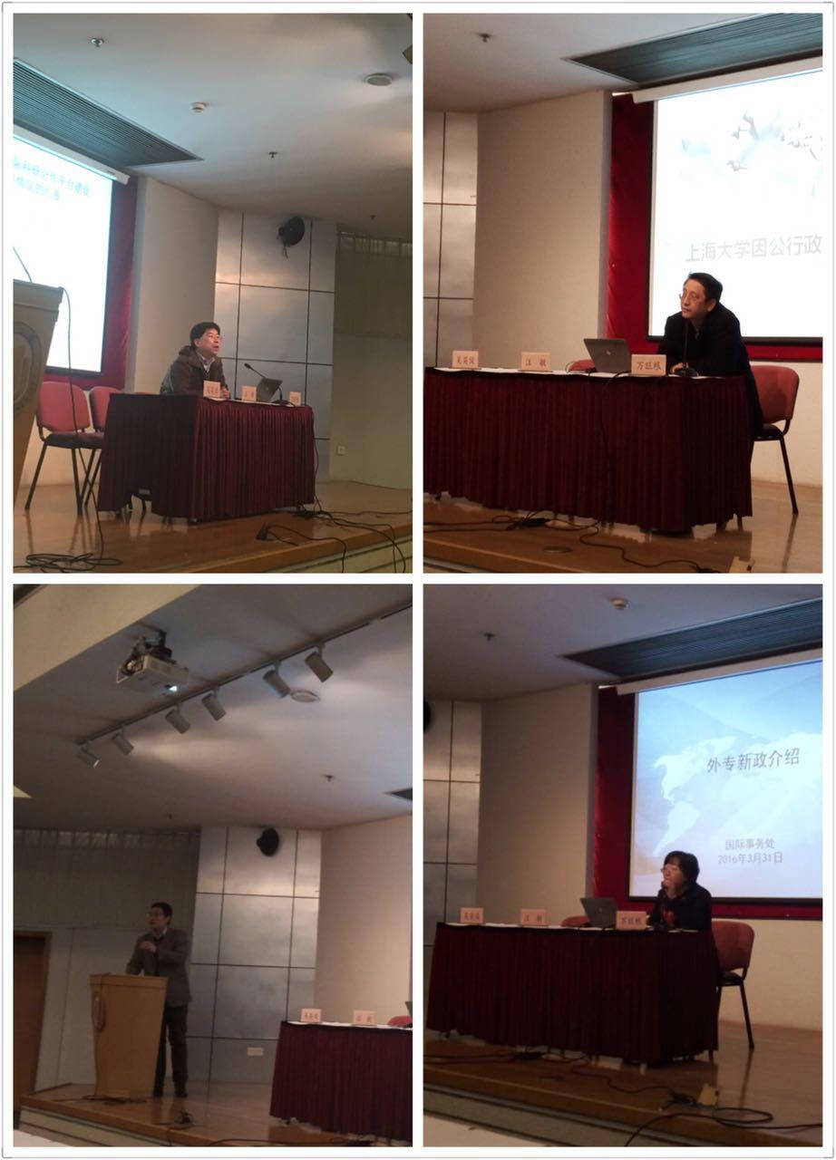 接着,国际事务处副处长倪兰传达了上海市外专新政。为服务具有全球影响力的科技创新中心建设,上海市将实施更加开放的海外人才引进政策。政府在明确人才标准、简化办理程序、出台人才签证、外国留学生在沪就业等方面进行改革试点。希望学校抓住有利政策,积极引进海外高层次人才,建设高水平人才队伍。