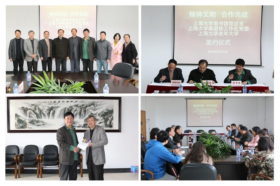 会上,校精神文明办主任刘绍学同志首先讲话,对三家单位合作共建精神文明表示祝贺,希望各方在共建中促进优势互补、把精神文明建设的种子种下去,期盼结出丰硕的果实;老年大学校长忻平同志指出,上海老年人占户籍人口比例首超30%,国家、市政府对老龄人口工作高度重视,提倡对老年人终身教育、第三年龄教育等,如何利用好图书馆的资源和老年大学的人才宝库,拓展合作领域,提升合作高度;图书馆党总支书记刘日宇同志从文化与文明两个视角谈起,认为图书馆与老年大学都是文化单位,中国有敬老爱老的传统美德,三方搭建一个合作平台,充分利用图书馆资源、空间等优势,拓展图书馆服务,使老年人“老有所为、老有所学”,并向与会嘉宾介绍了图书馆的读书月、读书服务月、新生季、毕业季等文明建设品牌;离退休处常务副处长余志龙同志介绍了老年大学的概况,感谢图书馆党政领导班子对老年大学的关心,为老年人提供一个很好的活动场所和平台;老年大学副校长姜继平同志,希望双方在书会、笔会、文艺体育等多方面加强合作交流。