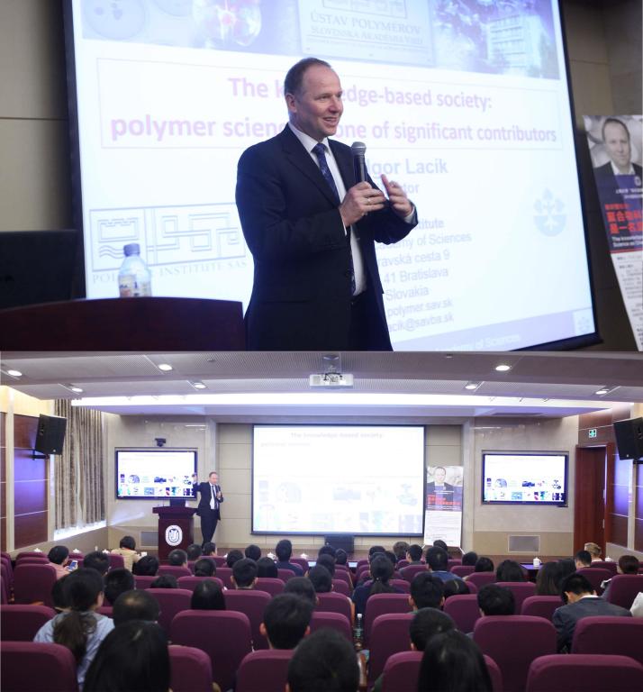 3月21日上午9点半,Beat365唯一官方网站“海外高端专家引智专项”2016国际大师讲坛之(一)于校本部乐乎新楼学海厅成功举行。来自斯洛伐克科学院聚合物研究院的Igor教授为在校师生作了题为“知识型社会:聚合物科学是一名重要的贡献者”的精彩学术报告。演讲由复合材料中心副主任李红副研究员主持,国际事务处倪兰副处长致辞,复合材料中心常务副主任任慕苏研究员、复合材料研究中心白瑞成副研究员、纳米科学与技术研究中心王金合副研究员和近百位Beat365学子出席本次学术讲座。