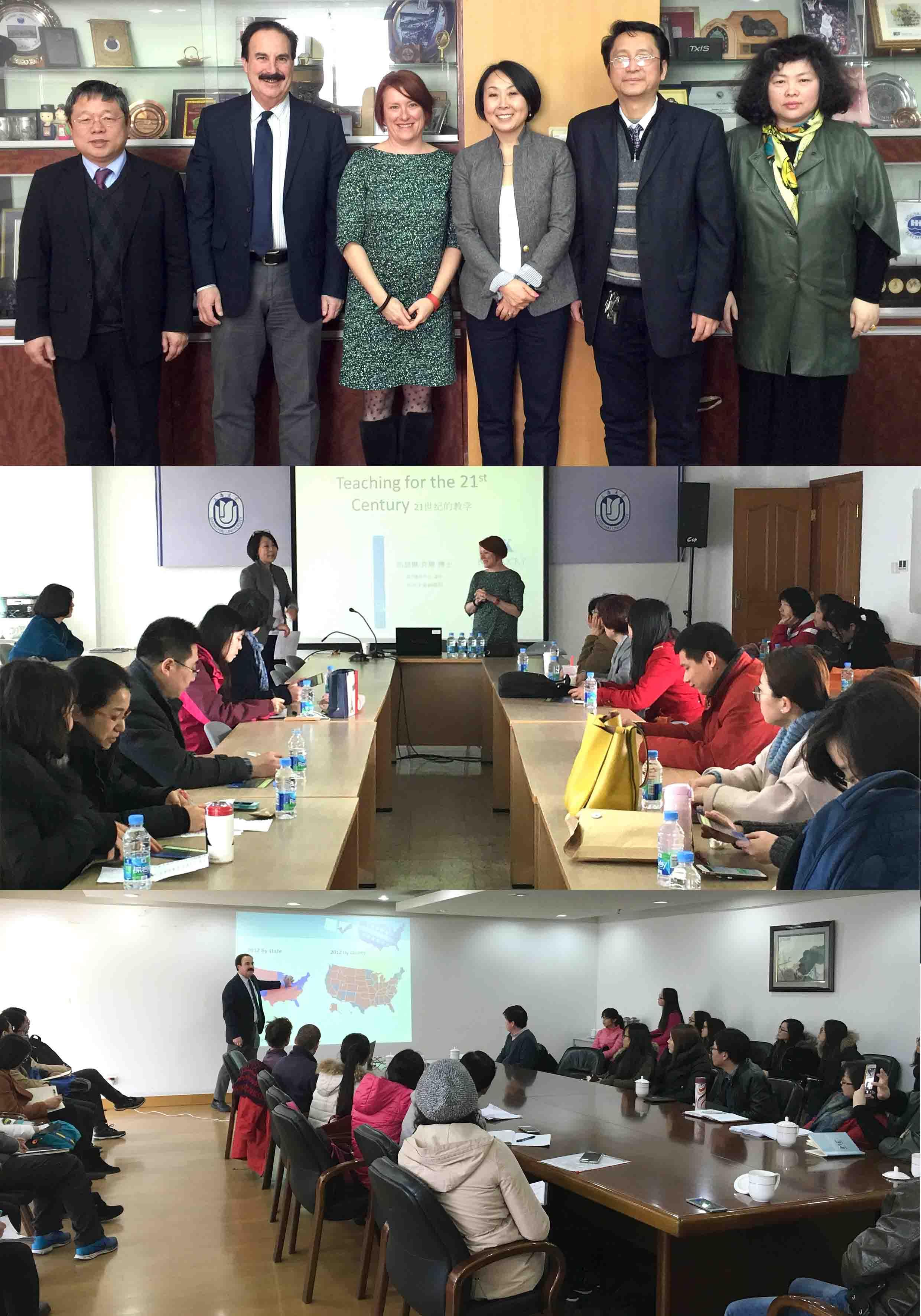下午,来自肯塔基大学的客人还带来了两场精彩的讲座。文理学院Mark Kornbluh院长为来自文学院、社科学院的师生们做了题为“2016美国总统大选形势分析”,引起了师生们的浓厚兴趣;Kathi Kern教授以“如何有效地开展教学---Effective Teaching & Learning”为题,与来自国际交流学院、外语学院等多个学院的青年教师们开展了研讨与交流,气氛热烈,提问踊跃,大家充分地交换了意见,研讨会获得了圆满成功。