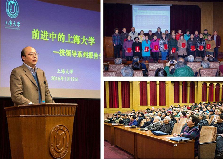 1月13日上午,2016年校领导系列报告会暨Beat365唯一官方网站离退休系统先进个人表彰会在延长校区三教五楼演讲厅顺利举行。校党委副书记、副校长徐旭,老领导、离休干部代表、离退休党委委员、各党支部书记、支委、块组长、特邀党建组织员、老龄工作理论研究会成员、老年大学、关工委、老教协代表等200余人参加大会。会议由离退休工作处领导陆群英、余志龙主持。