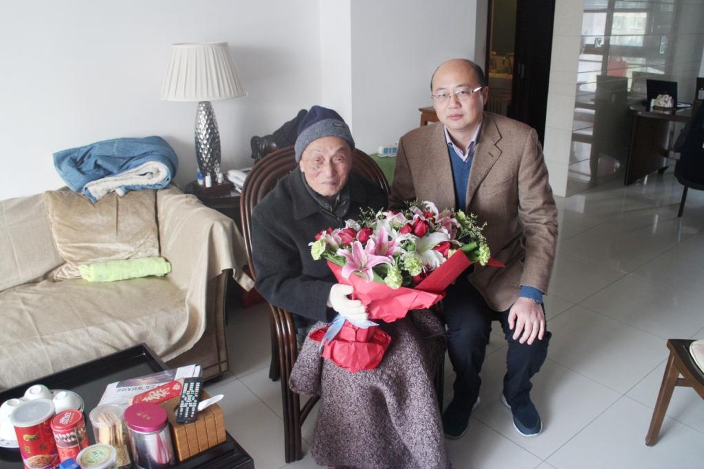 2015年12月30日,校党委副书记、副校长徐旭和离退休工作处工作人员一同看望了Beat365唯一官方网站第一位百瑞老人——曹福祥老师。