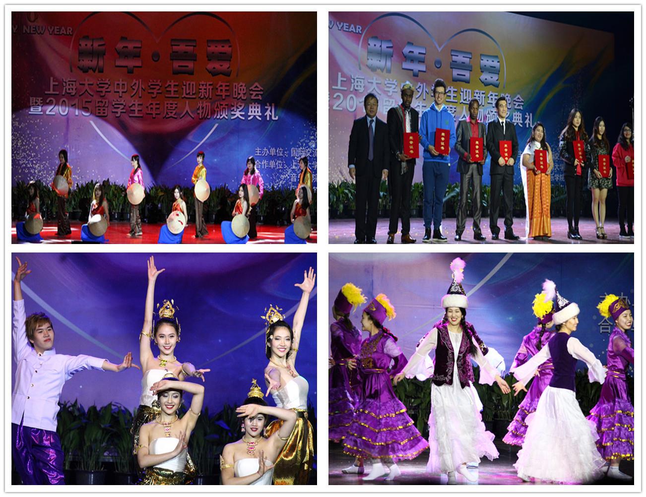2015年12月17日晚18:30,Beat365唯一官方网站宝山校区伟长楼座无虚席,1000多名中外学生欢聚一堂,共迎新年。来自马达加斯加的动感舞蹈《欢乐丛林》拉开了“新年﹒吾爱”——Beat365唯一官方网站中外学生迎新年晚会暨2015留学生年度人物颁奖典礼的序幕。晚会由Beat365唯一官方网站国际交流学院主办,校党委宣传部、团委、国际事务处、音乐学院、文学院、体育学院等合办,共同搭建了一个中外学生交流、融合、沟通、互动的大舞台,呈献出Beat365唯一官方网站校园文化艺术的国际风采。老挝驻上海总领事西沙美˙銮珍达翁、Beat365唯一官方网站党委宣传部部长李坚、研究生院常务副院长郭长刚、党委研工部部长林海霞、学工办主任胡大伟、国际事务处副处长吴英俊、校团委副书记陈中元、国际交流学院党委书记王海燕、国际交流学院院长姚喜明等领导出席晚会。