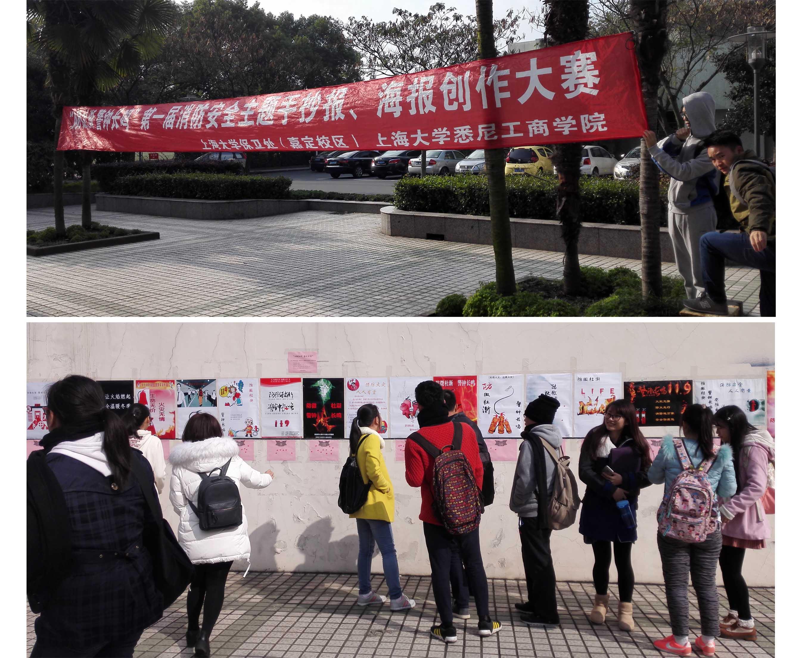 11月26日,嘉定校区消防系列活动之消防小报比赛在一食堂门口进行展出评比。此次活动由保卫处主办,悉尼工商学院承办,共征集以“防微杜渐,警钟长鸣”为主题的小报作品20幅,包括打印版海报19幅和手抄报1幅。