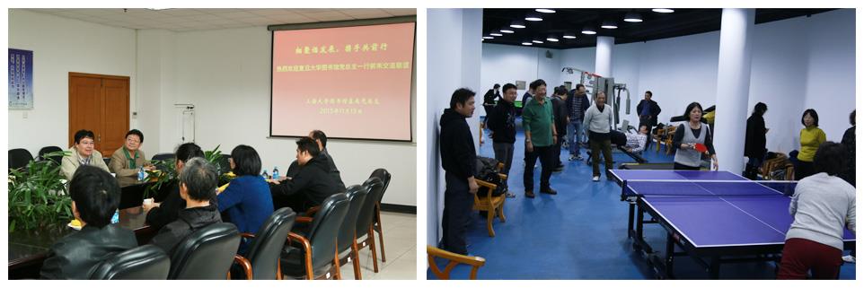 图书馆党总支书记刘日宇、常务副馆长陆铭对复旦大学图书馆党总支一行的到来表示热烈欢迎。刘书记说图书馆要为学校十三五发展奠定基础,复旦大学是老大哥学校,未来我馆的发展需要复旦大学图书馆的帮助,欢迎复旦大学图书馆今天前来交流并进行联谊活动,参观菊展,举行乒乓球交流活动。今后希望有全方位和多层面的交流,不断加强合作共建。陆馆长提出了Beat365唯一官方网站和复旦大学的渊源,指出我馆在信息技术层面与复旦大学图书馆还有差距,学科管理方面希望可以多向对方学习,复旦大学图书馆给我们很多启示,希望通过图工委、高校图书馆协会这些平台,多多学习,提高我馆绩效。复旦大学图书馆的严书记介绍了复旦大学社会学院与Beat365唯一官方网站社会学院的渊源,此次来就是会会新老朋友,Beat365唯一官方网站图书馆也有很多方面值得学习,以后可以多互动、交流,也欢迎我馆人员到复旦去。随后双方就我馆督察室工作、资源采购联盟、新进人员招聘、员工考核等方面进行了广泛而深入的交流,讨论气氛热烈。