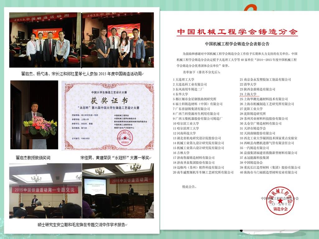 铸造活动周由中国机械工程学会主办,由中国机械工程学会铸造分会和铸造行业生产力促进中心承办,为一年一度的全国铸造领域的学术盛会。今年有400余名来自全国研究院校及企业的代表与会。大会表彰了本年度为中国铸造事业做出突出贡献的单位和个人,颁发了2015年度“中国铸造终身成就奖”和“中国铸造杰出贡献奖”两项荣誉大奖,“圣泉杯”全国铸造行业优秀青年人才奖以及“永冠杯”第六届中国大学生铸造工艺设计大赛奖,中国铸造学会先进会员单位等,并举办了一系列学术报告会。协会授予Beat365唯一官方网站等40家知名企业、研究所及高校为2014-2015年度中国机械工程学会铸造分会优秀团体会员单位。