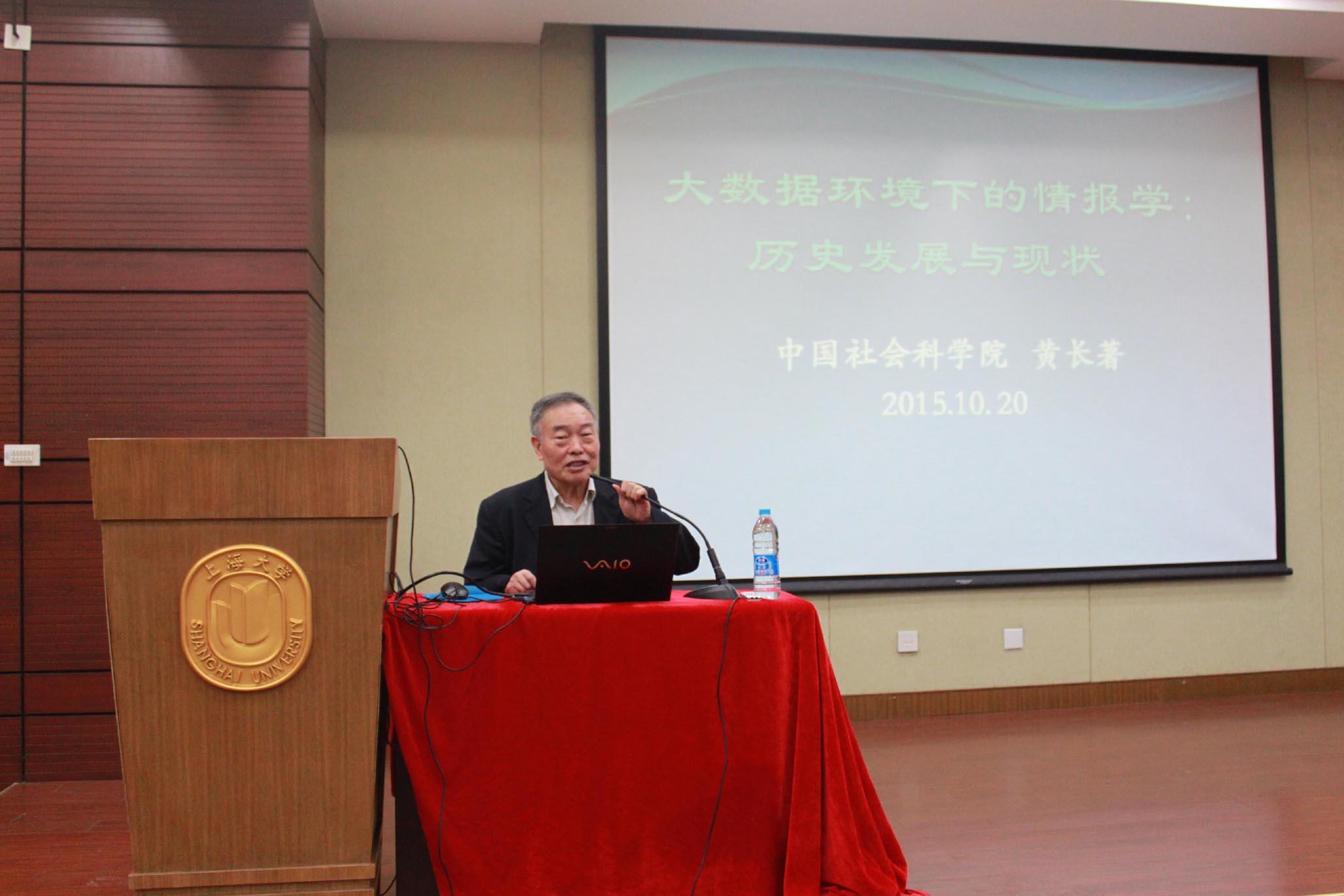 10月20日上午,图书情报档案系特邀中国社会科学院学部委员、全国社科规划办图书馆•情报与文献学学科规划评审组组长、国家哲学社会科学研究专家咨询委员会委员黄长著教授,在校本部东区国商楼101做了题为“大数据环境下的情报学:历史发展与现状”的专题讲座。本次讲座由金波老师主持,图情档系老师及全体研究生参加了本次讲座。