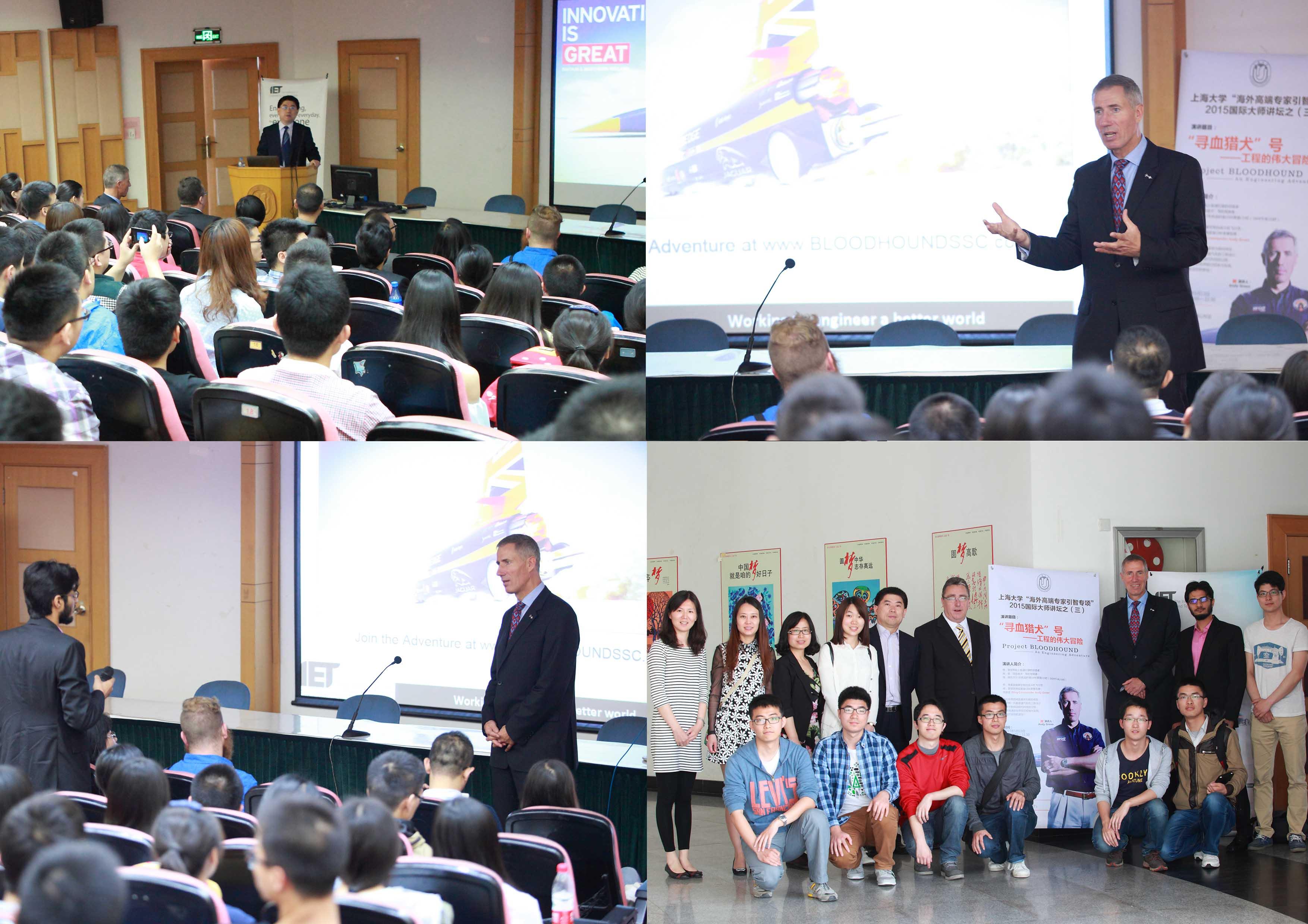 5月13日上午10点,Beat3652015国际大师讲坛之(三)在J楼103会议室正式开讲。此次演讲的题目是:Project BLOODHOUND – An Engineering Adventure“寻血猎犬”号——工程的伟大冒险。演讲人是英国皇家空军中校、“寻血猎犬”号的驾驶者Andy Green。演讲由国际事务处崔巍副处长主持,陪同Andy演讲的有英国工程技术协会(IET)国际运营总监Ian Mercer先生,以及中国区项目经理Christine Chen女士。来自智慧城市研究院、机自学院、通信学院、材料学院、中欧工程学院等相关学院的100多位师生共同聆听了此次讲座。