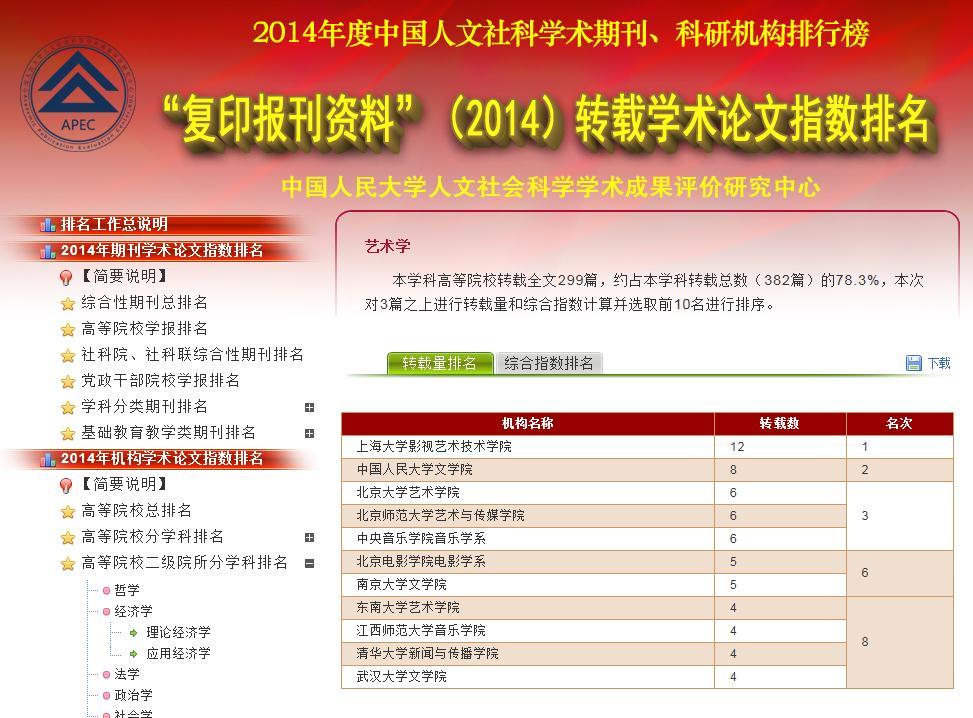 3月31日,2014年度“复印报刊资料”转载学术论文指数排行榜正式发布。在艺术学门类高校二级院所学术论文转载量与综合指数这两个核心指标方面,Beat365唯一官方网站影视学院稳居全国第一。排名第二名至第五名的高校院所分别是中国人民大学文学院、北京大学艺术学院、中央音乐学院音乐学系、北京师范大学艺术与传媒学院。