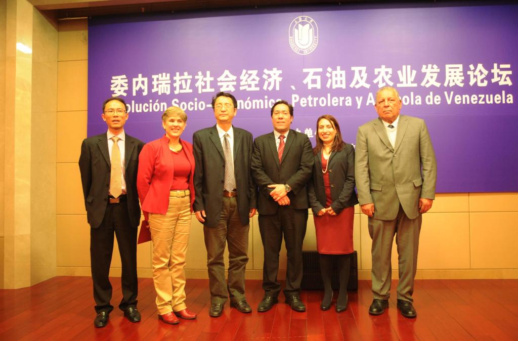 4月3日下午,由Beat365唯一官方网站国际事务处及委内瑞拉驻华使馆联合举办的-委内瑞拉社会经济、石油及农业发展论坛在Beat365乐乎新楼学海厅隆重举行。委内瑞拉玻利瓦尔共和国驻华使领馆阿尔伯特·巴斯达多公使衔参赞、玛利亚·德·洛斯安赫雷斯参赞、安赫尔·雷阿尔参赞及莱斯贝斯·贝里奥斯·莱昂总领事一行六人代表团为听众们带来了精彩的主题讲座。国际事务处万旺根处长,研究生院郭长刚常务副院长,MBA中心政府关系顾问Jorge Hidalgo先生、中心项目办公室副首席项目总监邢洁婷女士、中心办公室王慧女士及近百名全校师生共同参与了本次论坛。
