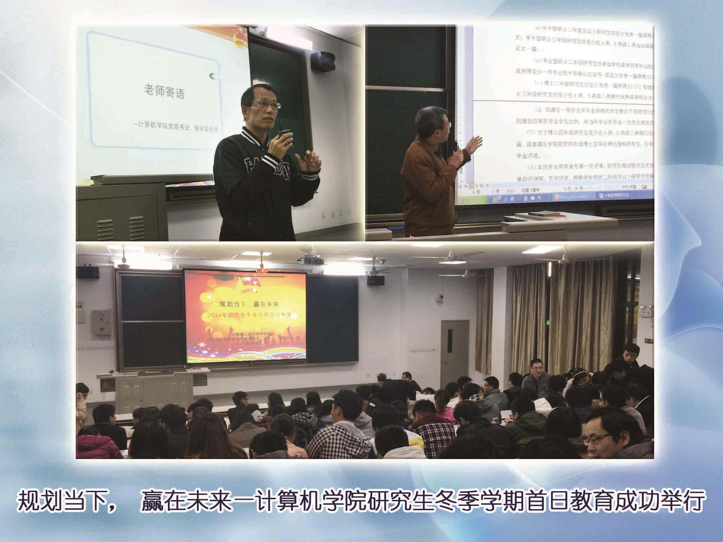 11月19日下午6:30 计算机工程与科学学院研究生冬季学期首日教育在宝山校区东区J101教室召开。本次首日教育由研究生专职委员夏明帅老师主持,计算机学院党委书记朱永华老师、副院长叶飞跃老师应邀出席了本次活动,计算机学院13级、14级的硕士、博士研究生参加了本次活动。