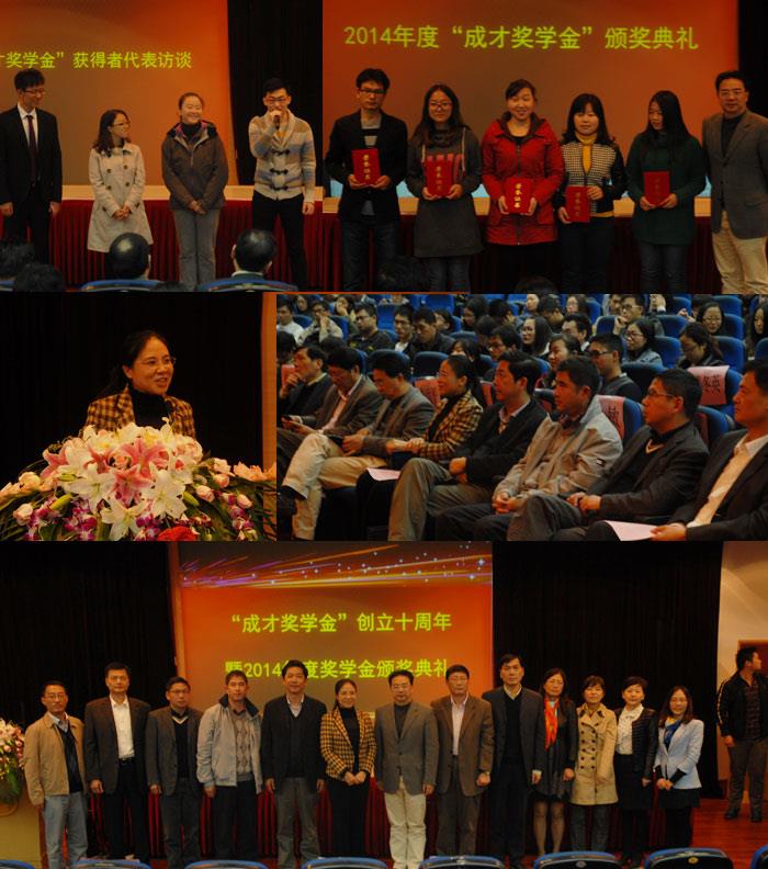 11月16日下午,环化学院在J楼202成功举办了“成才奖学金”创立十周年暨2014年度奖学金颁奖典礼。宝山区Beat365唯一官方网站校友会会长、宝钢股份有限公司党委常委、纪委书记李世平,副会长、宝钢工业技术服务有限公司副总经理解建平,Beat365唯一官方网站副校长、环化学院党委书记兼执行院长吴明红,上海合作组织公共外交研究院院长、音乐学院直属党总支书记李伟等领导和嘉宾出席典礼。出席典礼的还有宝山校友会校友、历届成才奖学金获奖代表及环化学院师生。