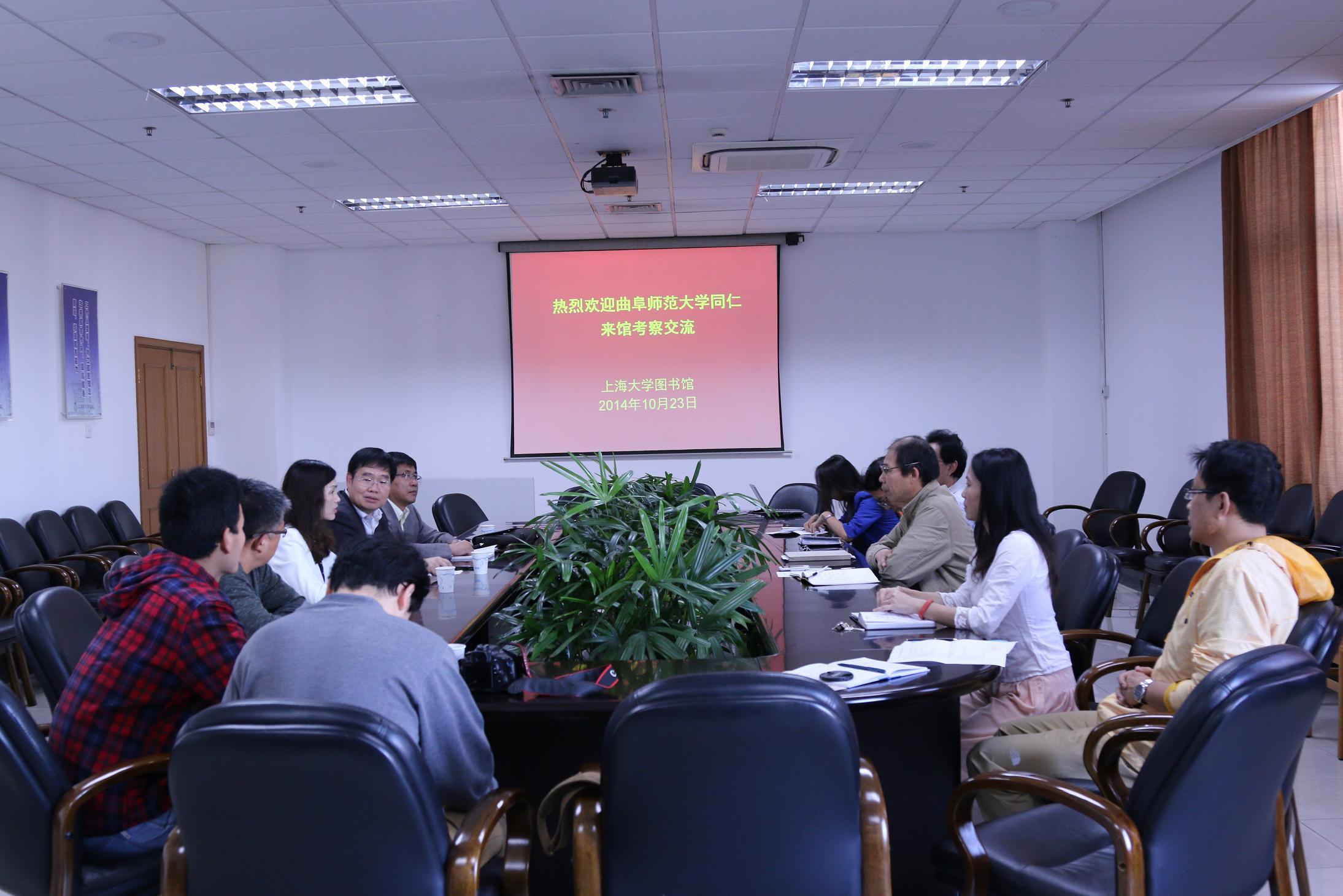 2014年10月23日上午,曲阜师范大学日照校区管委会主任助理、办公室主任池福安、日照校区图书馆馆长刘显平等一行6人莅临我馆,就图书馆管理模式、业务建设、空间规划等进行专题调研。我馆党总支书记、常务副馆长陆铭、副书记张庆兰、副馆长卢志国等参加接待,办公室、读者服务中心、资源建设中心、信息服务中心等部门人员参加交流。