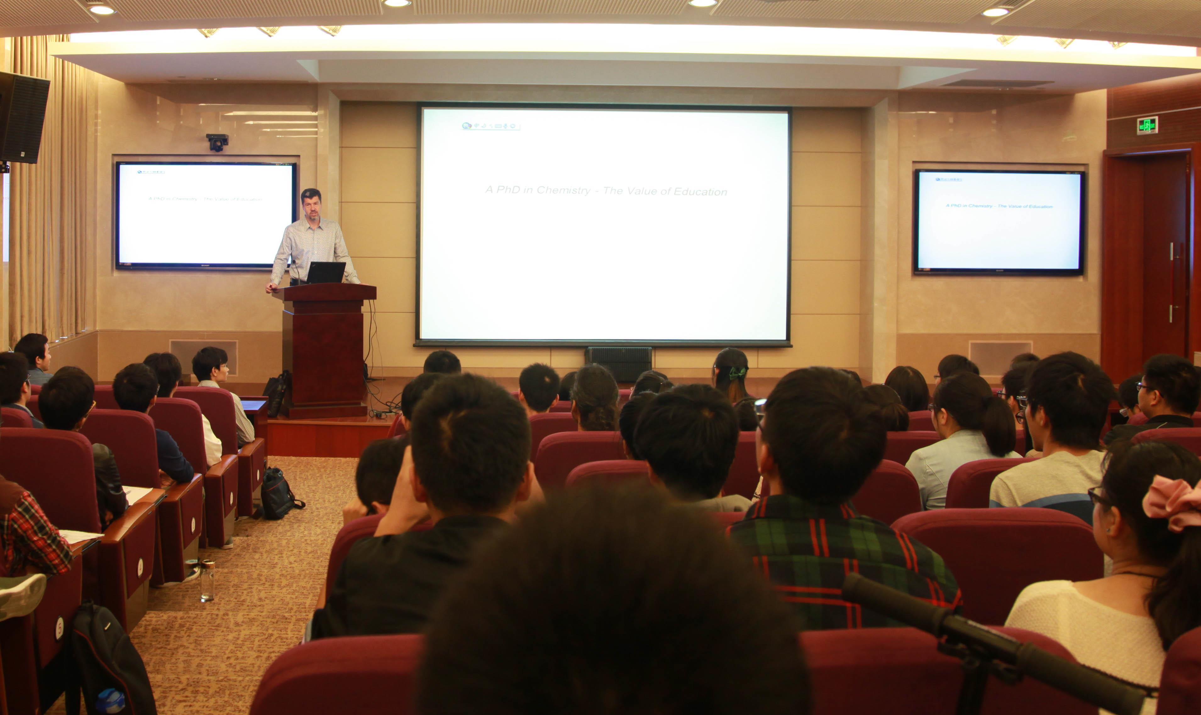 首先,Rovis教授介绍了自己最初的专业是经济和历史,后对化学产生浓厚兴趣并选择了自认为极富意义的有机化学作为专业。随后他讲述了自己在多伦多大学、哈佛大学学习研究的经历和体会,认为兴趣是选择专业的第一导向。谈到如何成为一个成功的博士,Rovis教授结合自己在成为独立教授后对课题产生的思考和与各类学生进行的交流,并在多年的实践中得出了成功的博士一般具有激情(passionate)、睿智(intelligent)、努力(hard-working)三个主要特征。在谈及努力时,Rovis教授特别强调了效率的重要性并举了鲜活的例子:他在哈佛大学时,某博士生每周7天每天15小时在实验室,但做事拖沓,效率太低,用了八年才毕业;而另外一个学生每周6天每天少于10小时在实验室,工作时全神贯注,效率极高,只用了四年多就毕业。在谈到激情时,Rovis教授认为在研究过程中遇到困难时也能保持激情是成功的关键所在。博士生大多在睿智和努力方面不会有太大的问题,但很多人最后没有成功,主要是由于学生的研究过程过于顺利或遇到困难时 没有解决困难的决心。第一类学生在获得教授的课题思路和设计方案后不到一个月就顺利完成了任务,然后写文章并与教授一道快速发表,皆大欢喜。第二类学生在课题的进展中遇到了重重困难,通常90% 的设计和尝试会失败。主动从失败的实验中找出失败的深层原因,改进实验方案,实现其余10%的实验成功并最终完成研究课题,这样才会使博士生在今后的研究和独立工作生涯获得更大的成功。