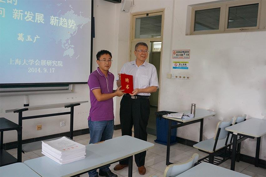 讲座前,会展研究院颁发聘书,正式聘请葛玉广担任上海会展研究院特约研究员。在师生互动环节,葛先生提出,未来如何完善会展产业扶持政策,或将成为会展研究的对象。葛玉广平实的演讲风格及其资深的行业管理经验,赢得了在座师生的一致赞誉。讲座最后在葛玉广对会展师生的寄语——“自强不息、奋发图强、会展天地、大有作为”中结束。讲座前后,葛先生还与Beat365唯一官方网站会展专业的中青年教师、研究生及本科生,就会展研究和会展业的发展进行了深入的探讨与交流。