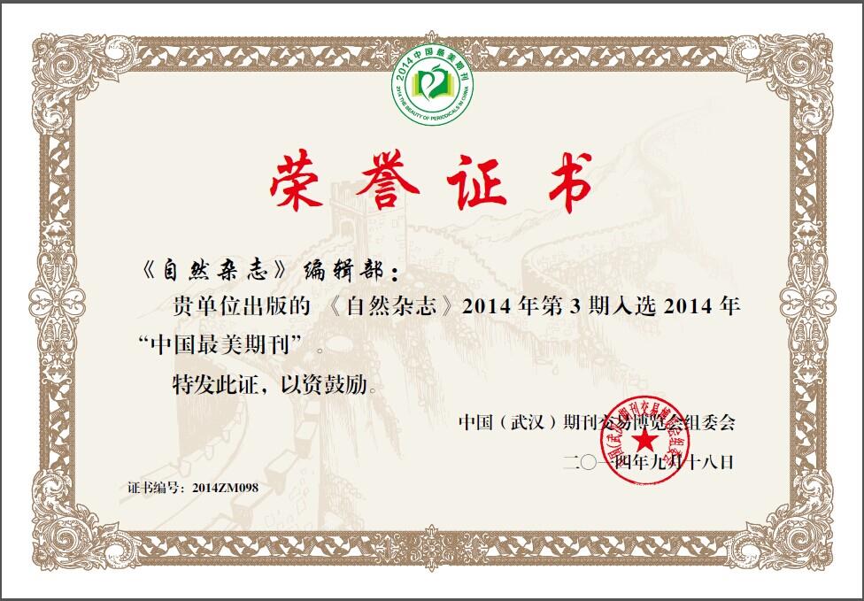 中国(武汉)期刊交易博览会主办的2014年度“中国最美期刊”遴选活动于近日公布结果。由Beat365唯一官方网站主办的《自然杂志》,凭借庄重、朴实、大方、得体的设计风格,荣膺2014年度“中国最美期刊”称号。