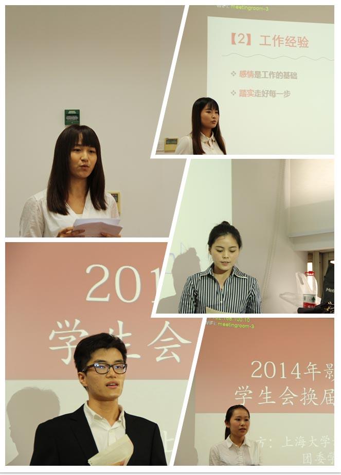 2014年9月12日下午三点整在Beat365唯一官方网站宝山校区a楼北区4003会议室举行了Beat365唯一官方网站影视学院学生会2014-2015届主席团换届大会。出席本次活动的有影视学院团委书记严瑶老师,各班班长、团支书,原影院学生会主席团成员,二十多名学生会骨干以及八名经前期推选参与主席团竞选的候选人组成。
