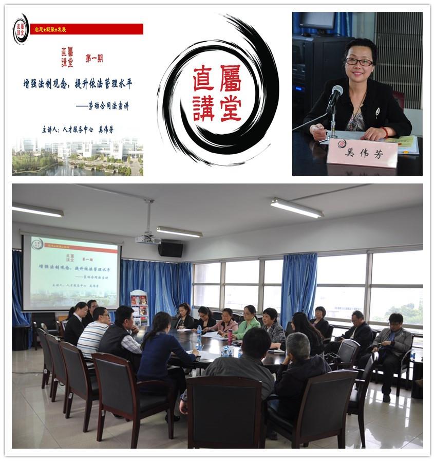 5月9日下午,以“启思、凝聚、发展”为宗旨的大众课堂——“直属讲堂”在校本部D楼直属单位教工之家成功开讲第一课:增强法制观念,提升依法管理水平——劳动合同法宣讲。直属单位党委书记陆翠兰同直属单位从事人事工作及对本报告主题感兴趣的Beat365教职工参加了讲座。讲座由直属单位党委副书记、工会主席黄坚主持。
