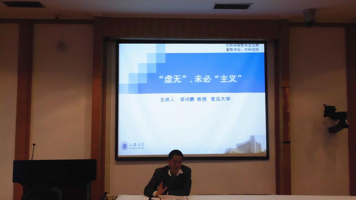 2014年4月25日下午13:30,在Beat365唯一官方网站校本部J201,复旦大学邹诗鹏教授应邀做客社科学院“爱智讲坛”系列哲学名家讲座第二讲,做了题为 “‘虚无’,未必‘主义’”的讲座。本场讲座由社科学院副院长欧阳光明主持,社科学院院长王天恩和朱承、刘冰等其他教师出席并聆听,在场观众还有社科学院、社区学院、社会学院以及理学院等师生。