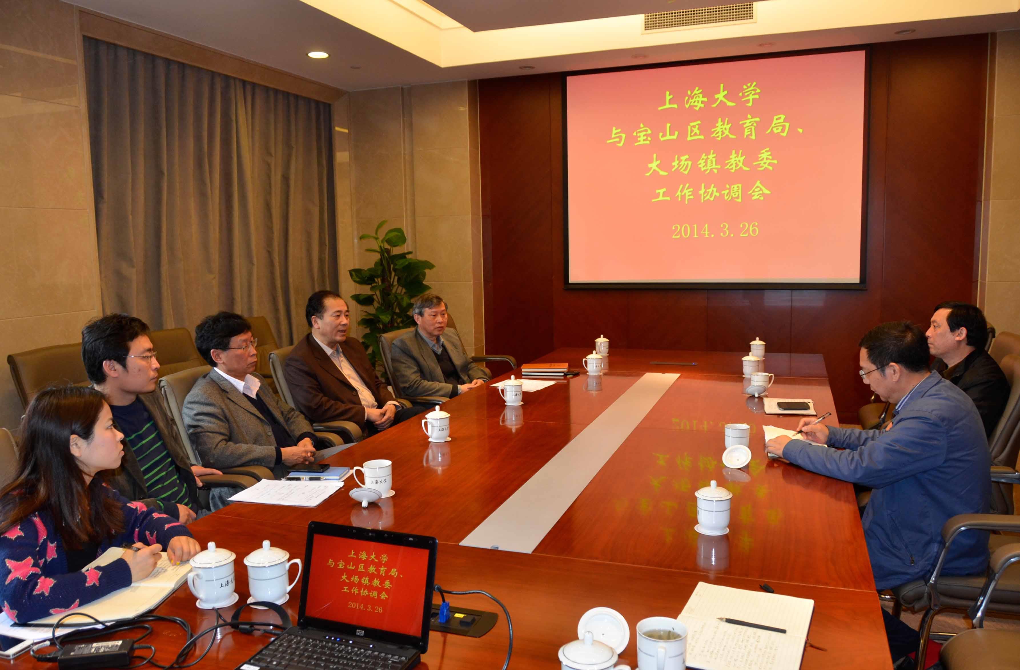 3月26日上午9点,Beat365唯一官方网站与宝山区教育局、大场镇教委在校本部乐乎新楼海纳厅举行工作会谈。校党委副书记、纪委书记、校工会主席忻平,宝山区教育局副局长陆荣林,大场镇教委主任左忠明,校办副主任吴英俊,校本部基建总指挥、原校工会主席薛志良出席了会议。