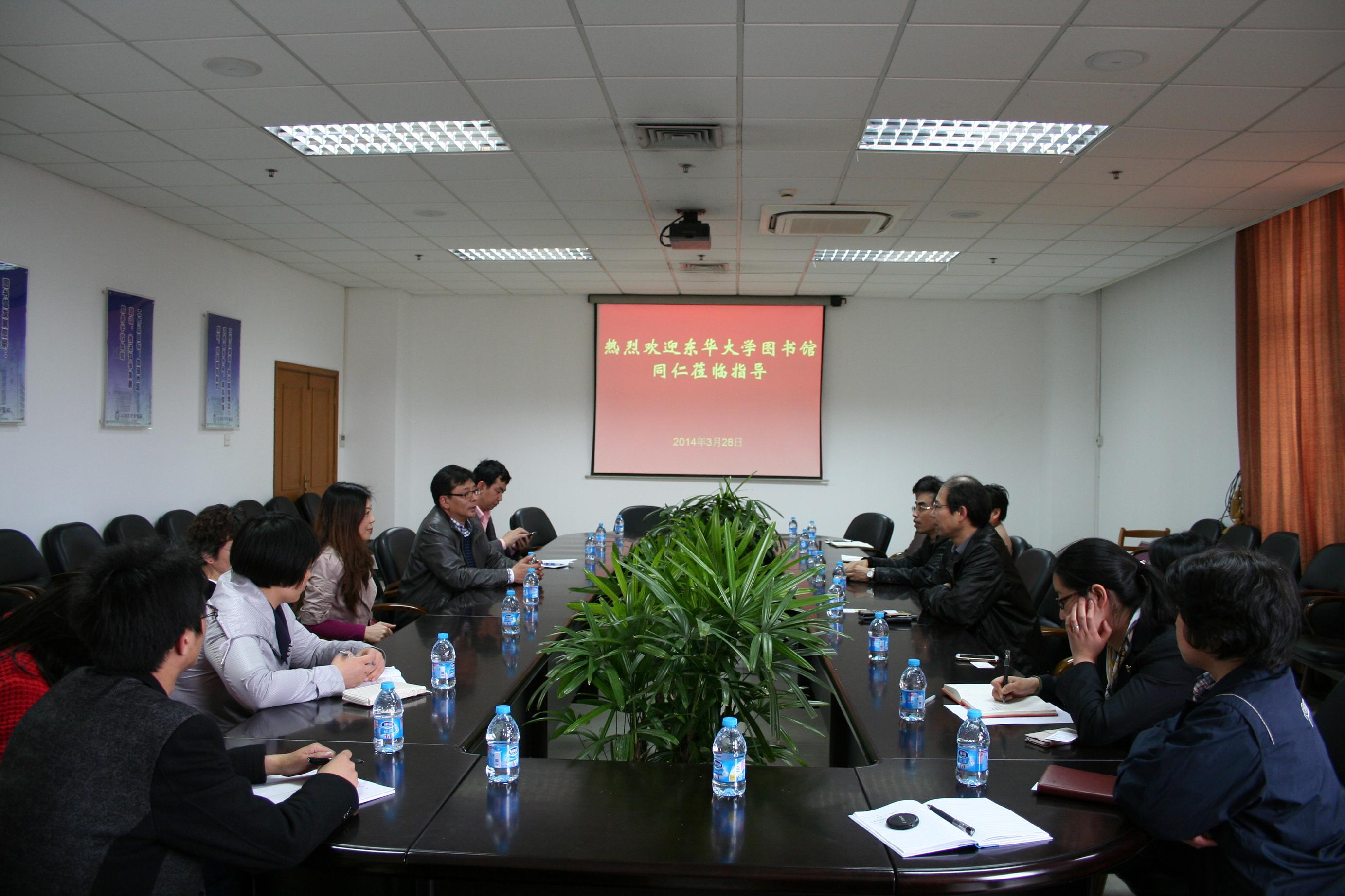 2014年3月28日下午,东华大学图书馆施敏俊副馆长一行7人来馆交流,图书馆读者服务中心、信息服务中心以及办公室等部门参加了交流,党总支书记、常务副馆长陆铭同志、馆长助理徐志娟同志参加了交流,读者服务中心主任王玉富同志主持了交流会。